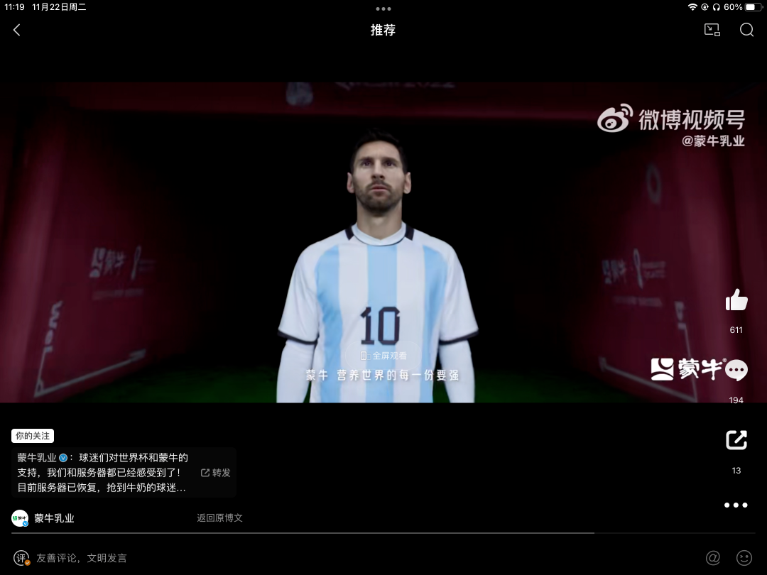 2022FIFA世界杯全球官方赞助商蒙牛携手代言人梅西,发布品牌短片,天生无惧挑战,一次次的摔倒成就屹立不倒的毅力,一次次的跃起去完成目标的飞跃。请不要相信梅西能创造奇迹,但一定要相信他无畏逆境,要强不息。