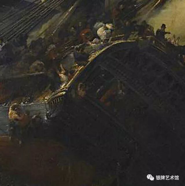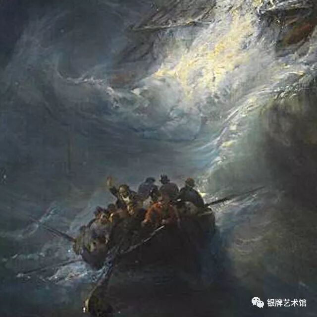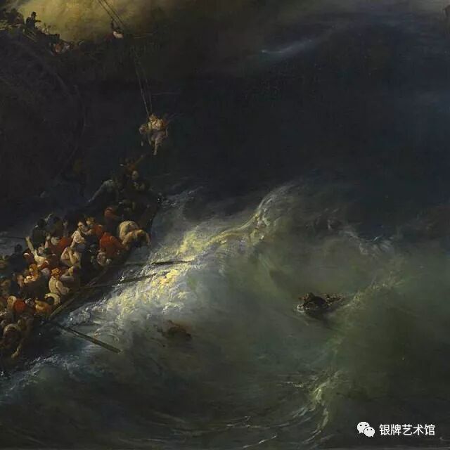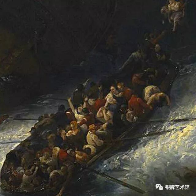 画中人们在自然伟力面前显得无比渺小,惊恐万分的人们在求生欲望的驱使下纷纷逃离帆船,乘上救生船逃命,海面狂涛汹涌,巨浪与狂风无情的摧残着船只,人们在挣扎、在呼救、在祈祷。
