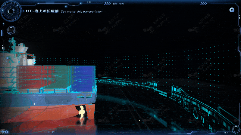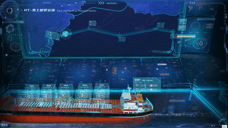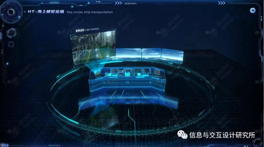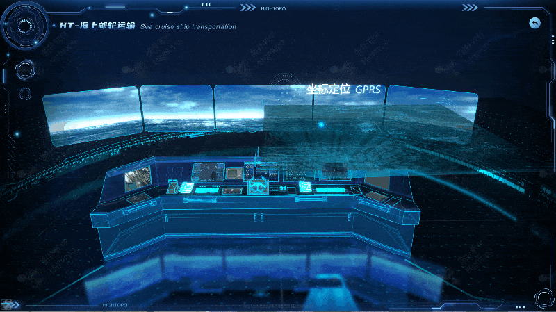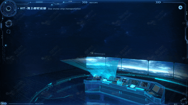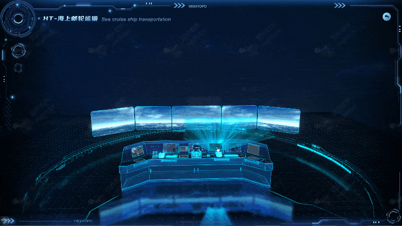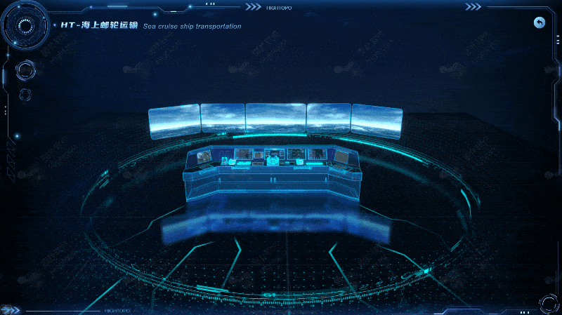 中控室综合展示区可查看船舱监控,海上气象情况,发动机数据监测,船体转向查看,坐标定位。综合展示区从船上和陆地上的各种来源收集信息,并在显示器上展示出来。船长和轮机长可以通过查看显示器上的信息来检查船舶的运行状况并制定航线计划,控制船舶。