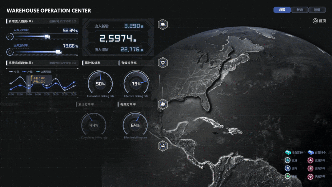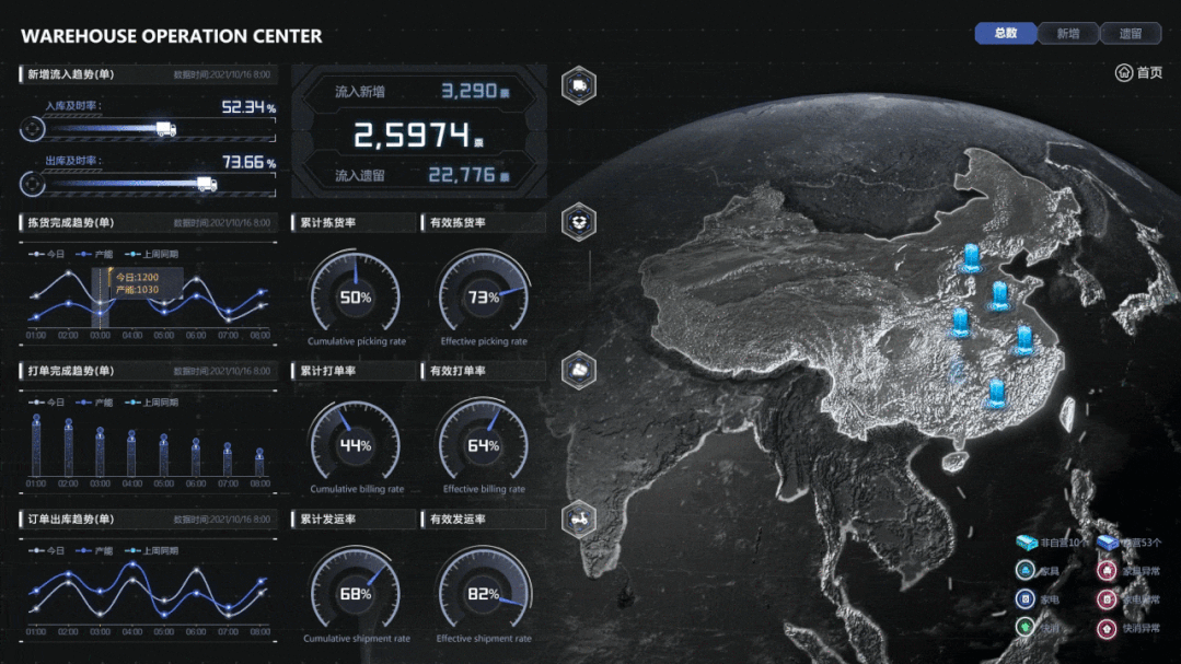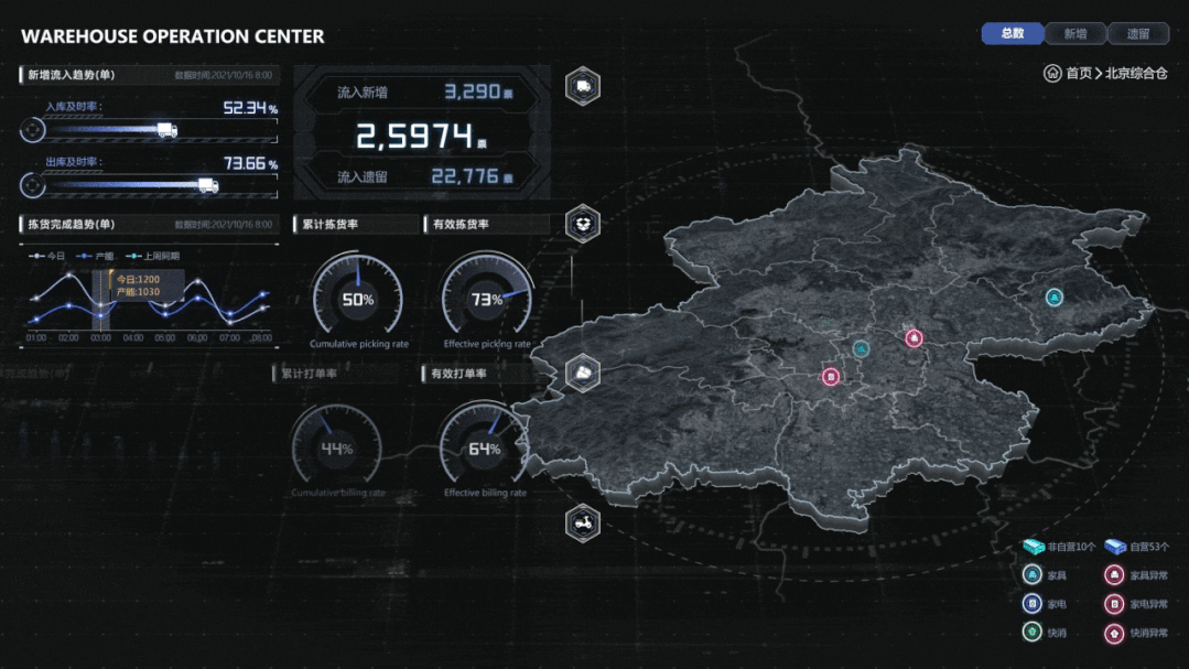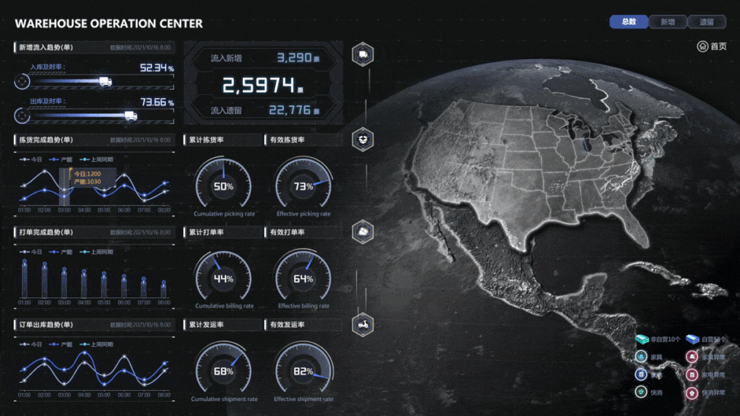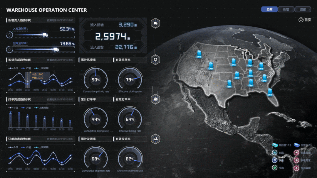 大数据可视化对物流行业运输、仓储、分拣、配送、包装、流通加工、客服等全供应链数据,进行实时监控与分析,通过快速高效的分析、呈现处理,保证物流的高效与服务品质。