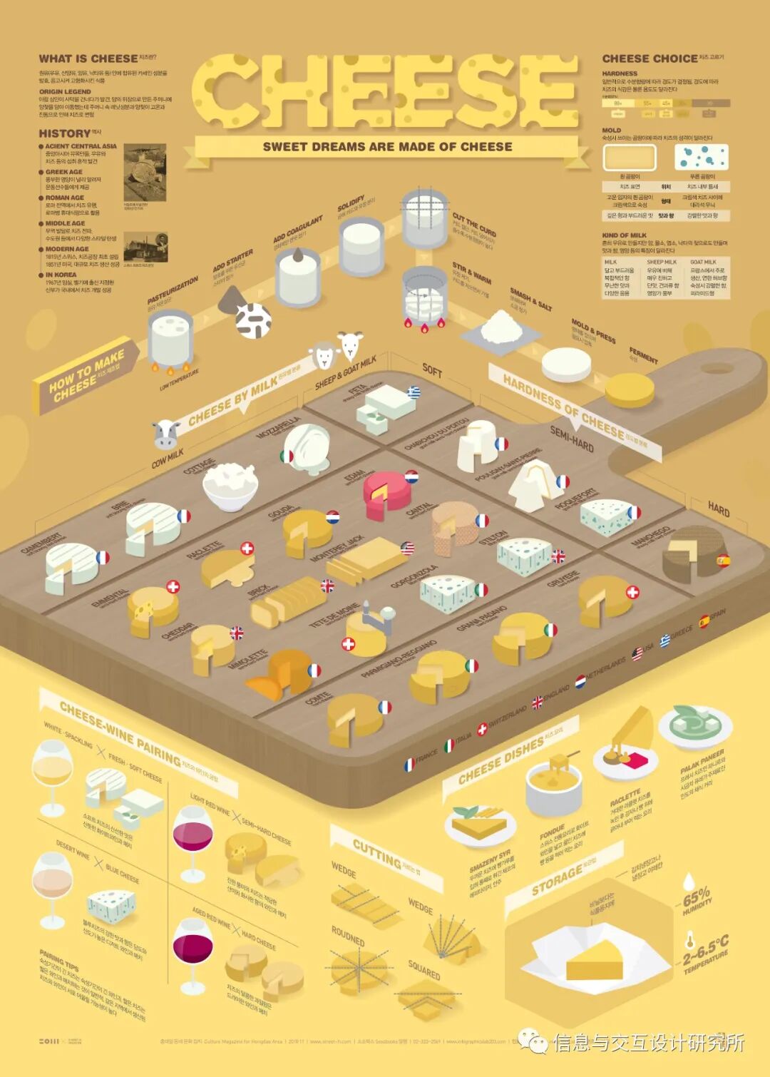 该作品一方面表达了芝士详细的制作流程,另一方面列出了不同国家的知识的种类,甚至是芝士不同的切割方式,使人们可以对芝士进行迅速且全面地了解。