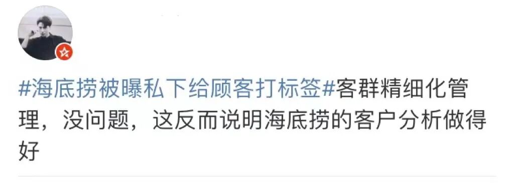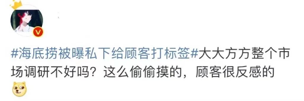 近日,网友爆料称海底捞在会员系统里私下给顾客贴标签,其中包含体貌特征和个性需求等,甚至标记客人为“喜欢在APP上投诉”。于是#海底捞被曝私下给顾客打标签#“喜”提微博热搜榜榜首。