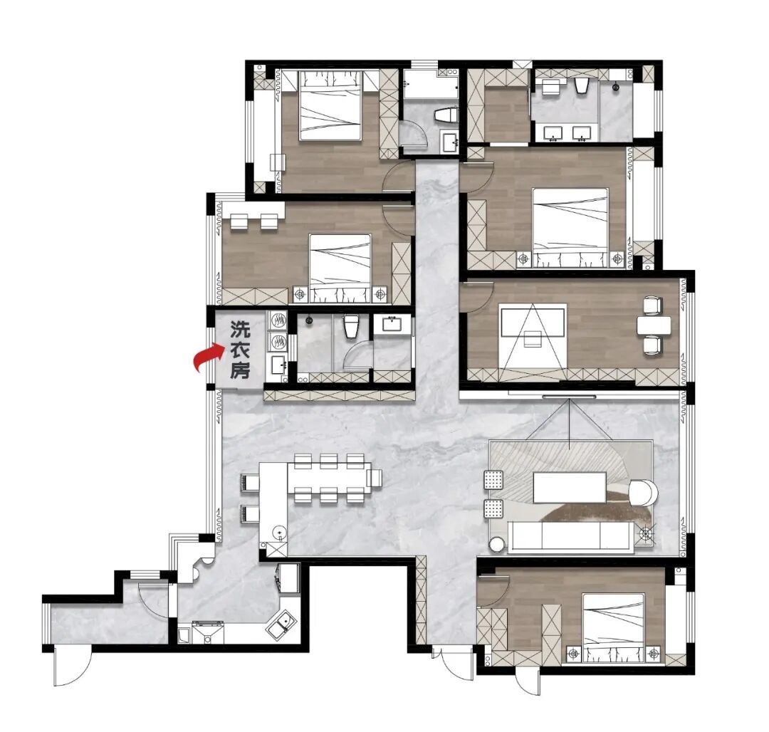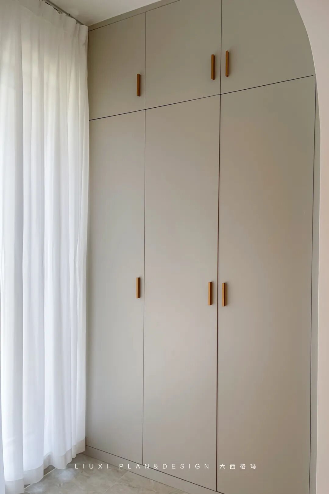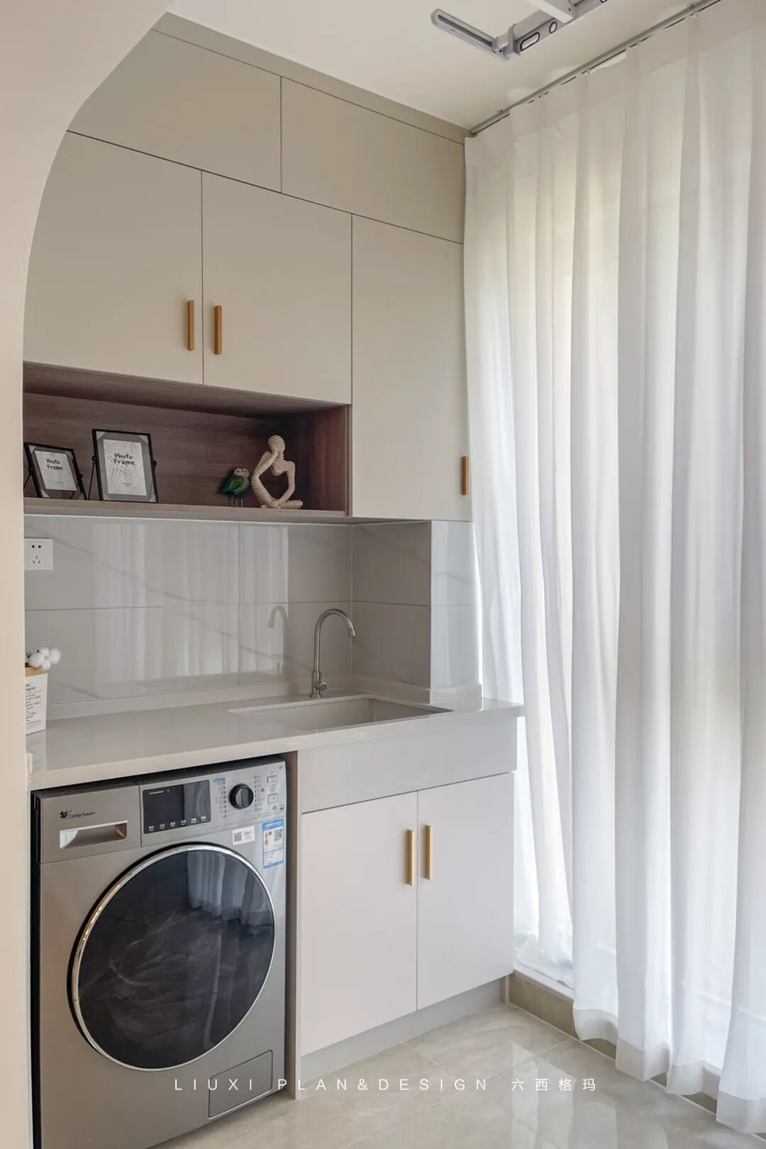 一般阳台都会晒衣服,打通后,花花绿绿的衣服着实拉低美观度。上图这个案例是一个188㎡的大户型,拥有双阳台,设计师专门打造了洗衣房,从而释放了客厅阳台空间。