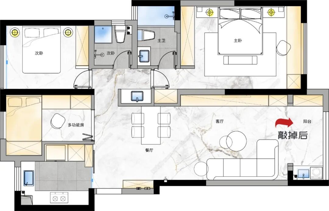 上述案例为79㎡精装房改造,拿掉原始的阳台门后,客厅变得更加明亮敞阔。