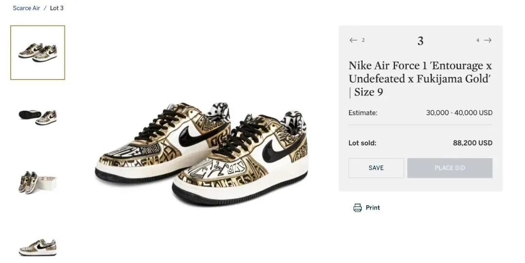 是的,又是苏富比。在 2021 年末,苏富比将与《Entourage》相关的一套鞋款进行了拍卖,其中就包括上图这双 "Gold Turtle",而它的成交价格达到了惊人的 88200 美元。