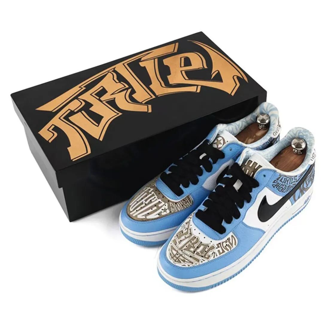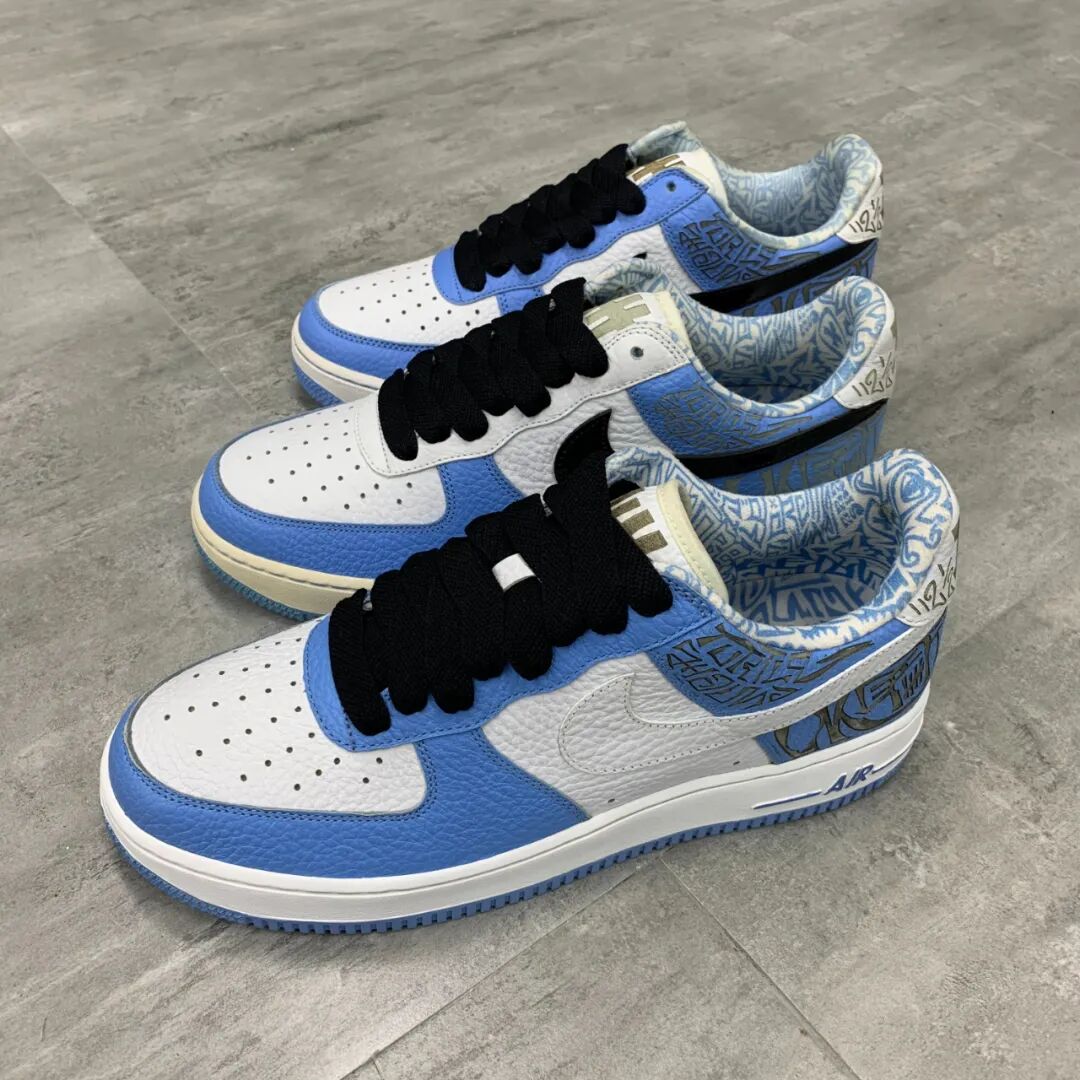 在这双鞋的外观方面,它由著名设计师 Mark Smith 主导设计。作为创意厨房 Laser Project 主要参与者的 Mark Smith 以白蓝色的 AF1 为画布尽情挥洒创意,用镭射技术在鞋面蚀刻出了众多精细且别致的图案和花纹,而这些图案也与《Entourage》剧集或者 AF1 自身有关。