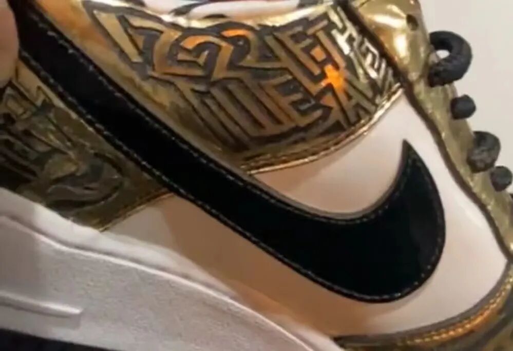 同样是来自 Mark Smith 本人的曝光,这双 "Prototype 2" 是早于最终版 "Gold Turtle" 的样品。在原来的剧情设定中,Fukijama 给到 Turtle 的是一双用马克笔涂鸦的 AF1,而 Mark Smith 决定用镭射技术来创作图案,于是就有了这一双完成度很高的 "Prototype 2":这个版本同样是在白色的漆皮上镭射了复杂且精致的花纹,并且这版鞋的部分设计元素也出现在了最终版本,白蓝色的 Entourage 上(比如黑色漆皮材质的 Swoosh)。原本剧组已经同意就让这双 "Prototype 2" 出镜,直到 Mark Smith 拿出那双金光灿灿的 "Gold Turtle" 后又让众人改变了主意。并且他还曾透露这一白色的版本现在 HBO 的手里。