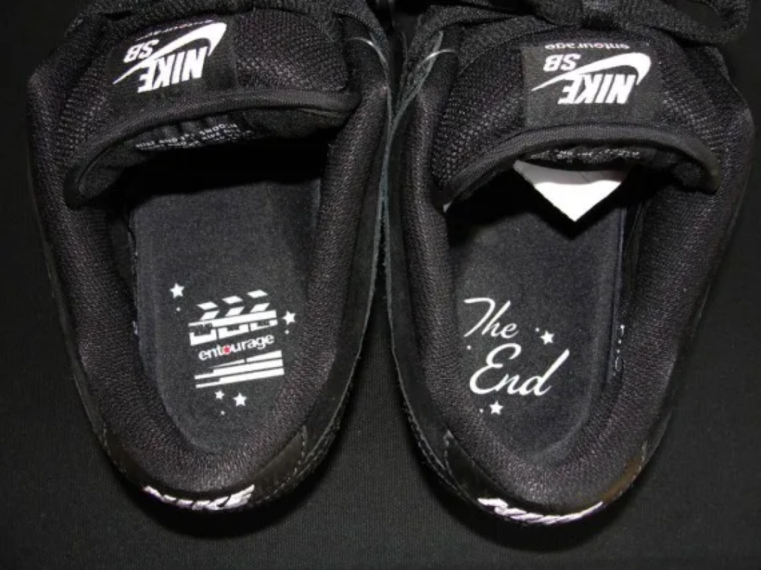 亲友限定款的 Nike SB Dunk Low,数量在 50 双左右。这一款整体配色十分低调,鞋身大部分被黑色麂皮与爆裂纹材质覆盖。在鞋舌以及鞋垫上可以看到与本剧相关的细节,同时也是为纪念《Entourage》在 2011 年正式完结。