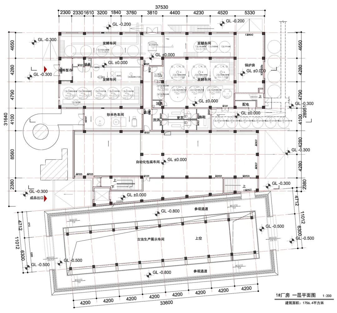 工厂拥有古法酿造工艺(供观光展示和手工精品化生产)和现代化生产工艺(科技工艺批量化生产)两条独立运行又内部联通的生产线;两条生产线与观光动线又巧妙相交,在不同标高重合,向游客展示两种酿造工艺及其多种工序。