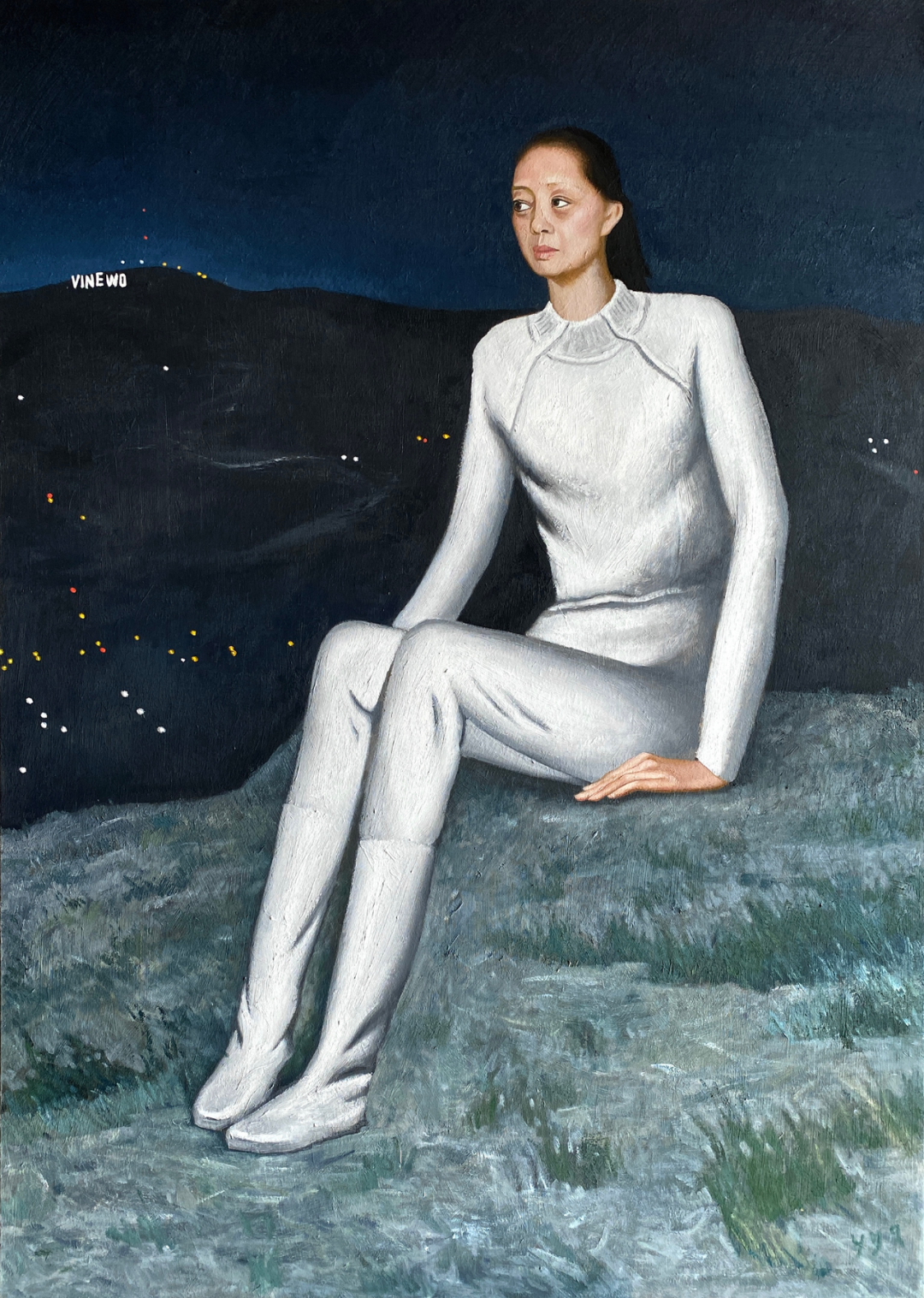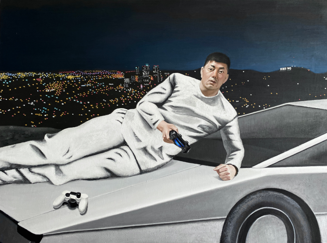 真实与虚幻对峙,它们往往分不清彼此,而我们在二者的交界完成一个个世界主线。人物在杨玥琪的笔下以一种特有的“真空抽离”状态被安置在缺乏安全感的背景中——没有旁人,没有回应。这种“真空状态”营造了游移的抽离感,好似真实的一切都在按部就班地发生——洛圣都夜晚的灯火通明;好麦坞山上的招牌正襟危坐;天边的白晕好似熊熊大火正在燃烧,但趴在地上的人却无动于衷。杨玥琪将一切解释余地留存在画面之中,将角色去除了个体情感后邀请观众完成画面叙事的最后一环,构成了叙事的悖论。