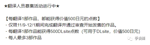 11月9号也就是昨日,日本二次元贩卖网站DLsite突然推出了“大家一起来翻译”的功能。手谈姬仔细阅读后,总结下来,这是一个官方招募汉化的哇塞操作。