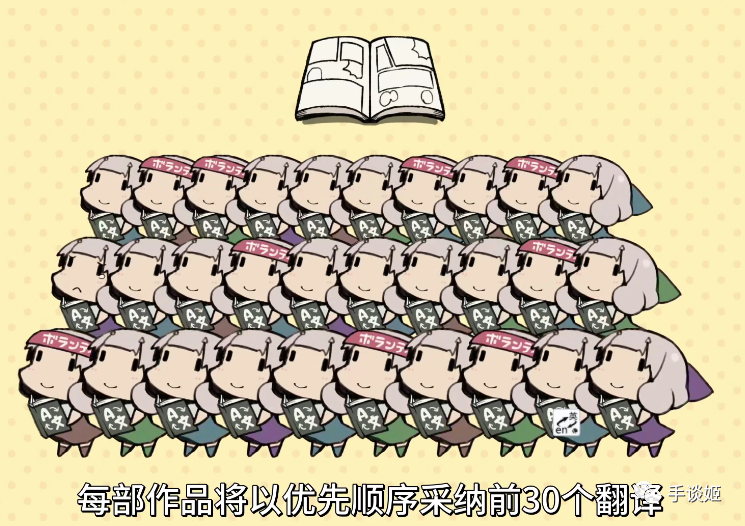 “大家翻”也好理解,所谓的“大家”,就是说“相同的作品可以由多人翻译”,每部作品将以优先顺序采纳前30个翻译,在审核后,将会采用用户评价的方式优先显示翻译版本。