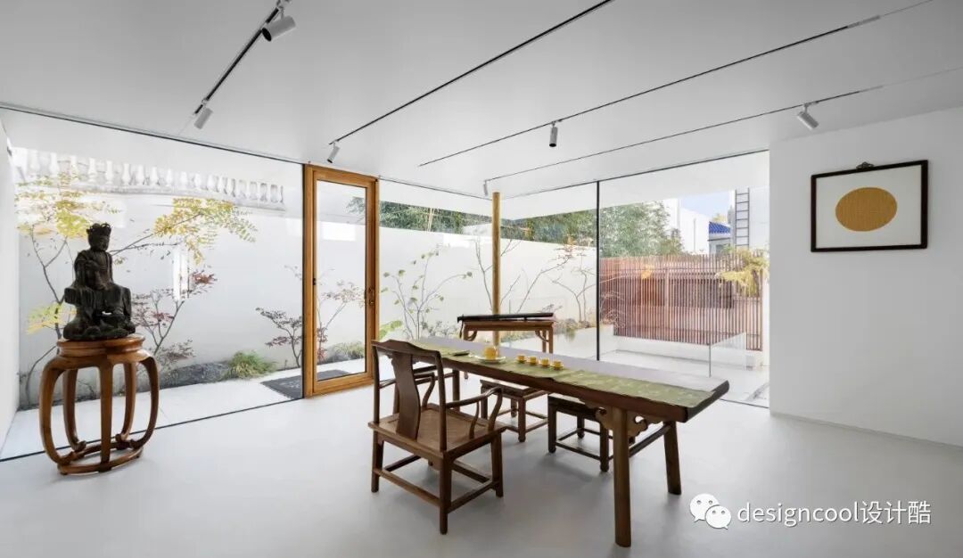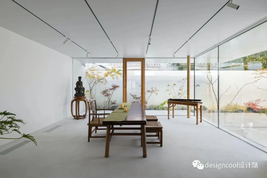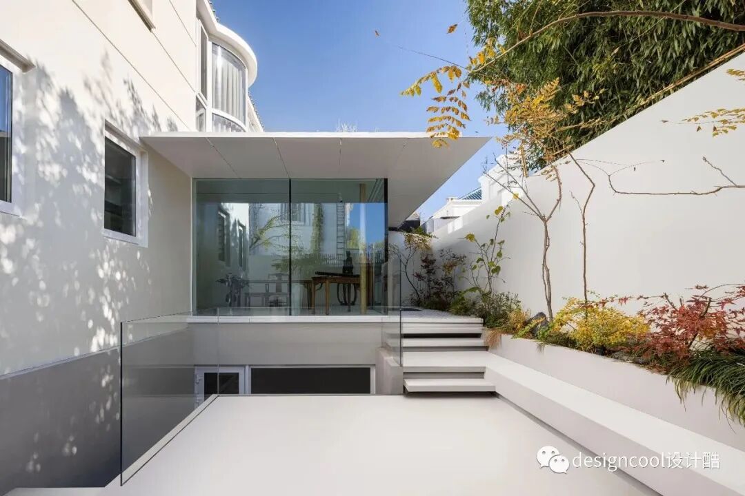 一层深处,与庭院相连的玻璃屋,是主人最喜爱的茶室。它由铝板顶面与玻璃隔断构成,强调留白、悬浮与延伸感。室内的布局,空灵且飘渺,设计师借助家具陈设,将人的视觉重心由中央引至四周,虚实对比下,时间的概念仿佛消失,取而代之的是一场精神的对话;室外的植物景观,在白色围墙的映衬下,如同屏风画卷般,可观四季之美。作为以茶会友的附属空间,这里充分体现了自由意趣。穿过茶室,庭院的设计又回归于极简,通过结构改造实现了下沉式的露台、旋转式的地下通道,令户外空间更加立体,富有层次感与连贯性。庭院中的地面、台阶、围墙都被统一在温润的白色背景之下,也在无形中回应了室内的空间风格,将住宅的设计理念延续贯通。