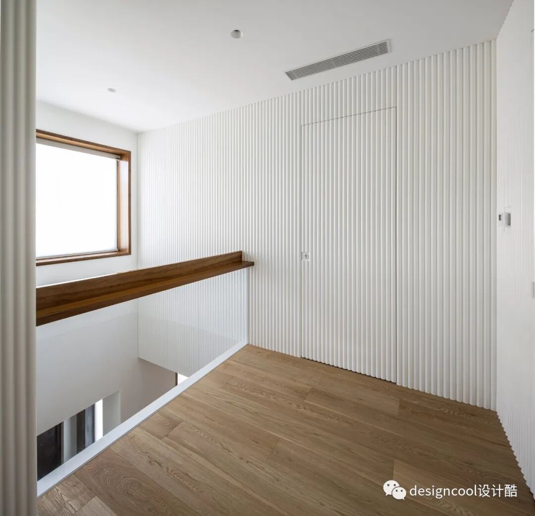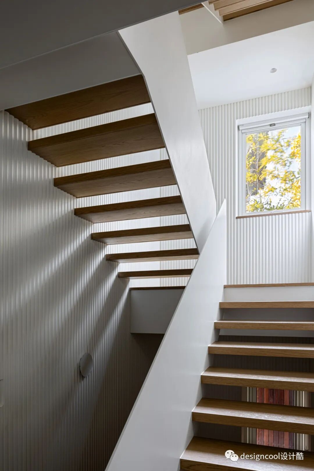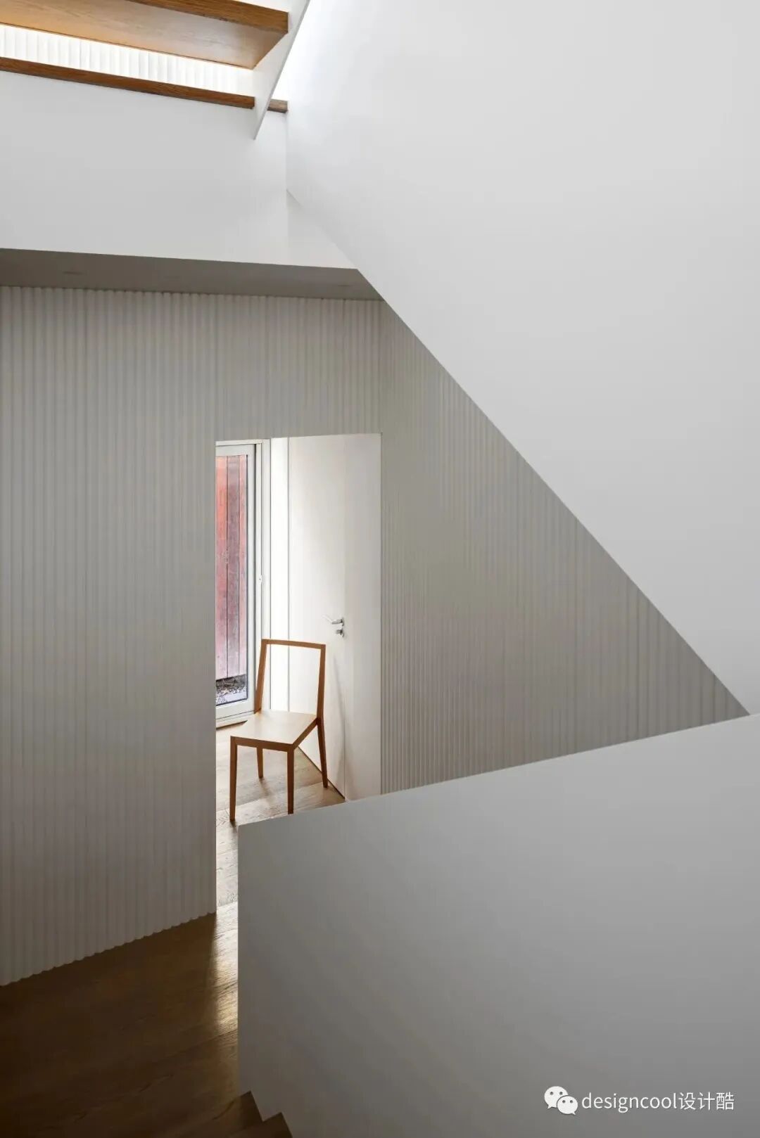住宅中的楼梯厅,结合上、下动线,将共计四层的空间有序串连。悬浮踏步、一片式扶手、丝丝条纹的造型墙,营造出温暖的包裹感。光线被周围的材质“软化”,影子也变得温柔起来,为通往书房、卧室等更私人化的休息区,铺陈出沉静温馨的氛围。值得一提的是,原本难以利用的尖顶阁楼,如今被改造成了可以冥想、抚琴、品香的小型休息室。借助倾斜的房梁结构与白色风格,表达纯粹、纯净的精神世界。