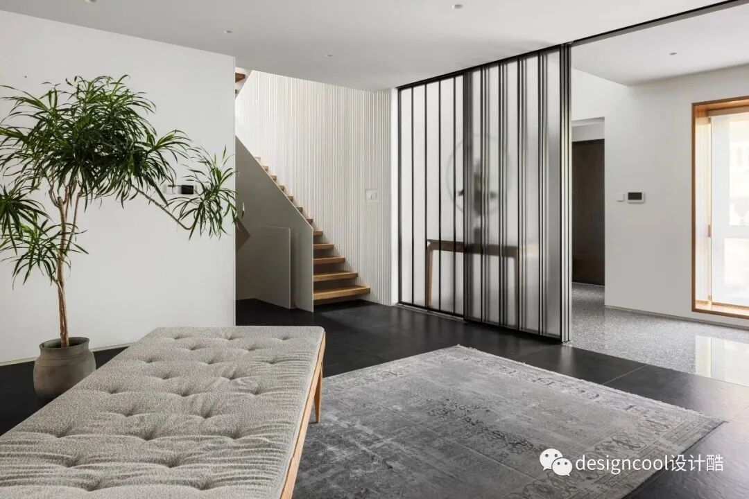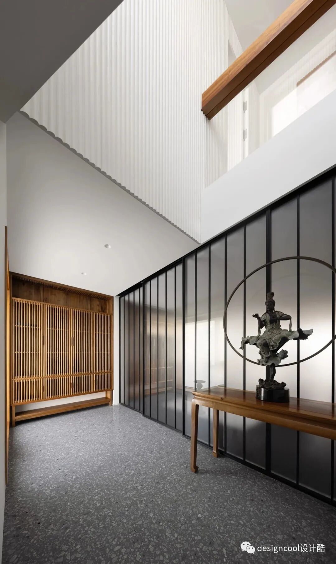 步入玄关,建筑师通过改变房屋结构,营造出“天井”的概念。玄关上方原本的洗手间区域被移除,制造出一个5米的挑空,将二楼的光线直接引向一楼。同时,通往厅堂的一侧,采用黑框玻璃推拉门,作为一个“过渡介质”,开启即将到来的“深色厅堂”。材料上,灰色水磨石地面,起到与户外衔接的作用;而弧形造型墙,则柔化了光影,并带来韵律感,与格栅储物柜、推拉门形成连贯的呼应。