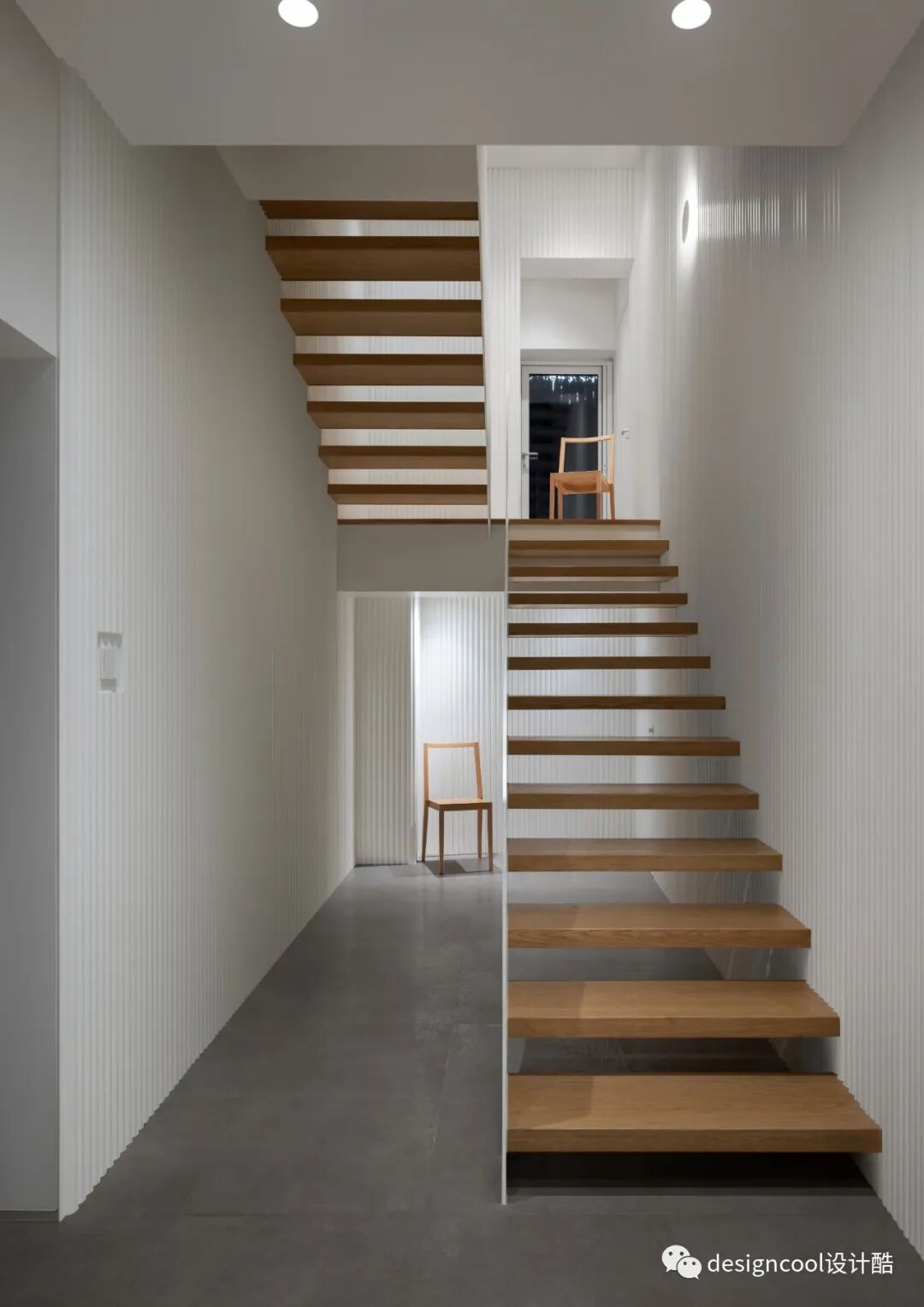 The staircase hall leading to the upper floor is designed with floating steps and a one-piece handrail. The surrounding white arc-deco wall creates a sense of wrapping, like a gentle white passage, paving a quiet and warm atmosphere for more private rest areas such as the study room and bedroom. It is worth mentioning that the attic, which used to be difficult to use, has been transformed into a small space for meditating, playing the zither, and incensing, expressing the purely spiritual world.
