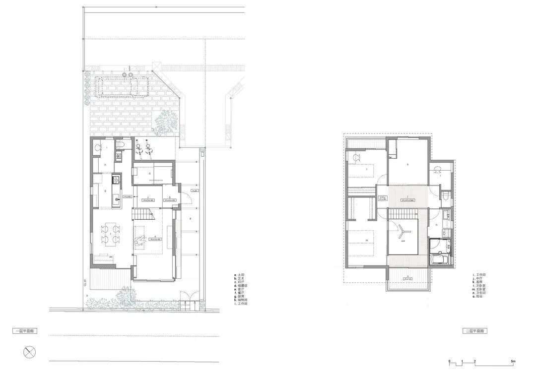 为了满足一家三口的起居生活,这栋双层住宅将一层空间设定为开敞式的活动区域,包含前后庭院、半户外廊、客厅、餐厅、厨房,这也是“土间”概念被最大化的体现,从半户外一直延伸至室内客厅;二层在回形动线的基础上,设置了卧室和浴室,中心的挑空处为房子引入更多阳光与良好通风。而每一层在地面台阶、天花上的微妙高差变化,也让整个住宅生成了自己的立体序列,更富趣味和层次。
