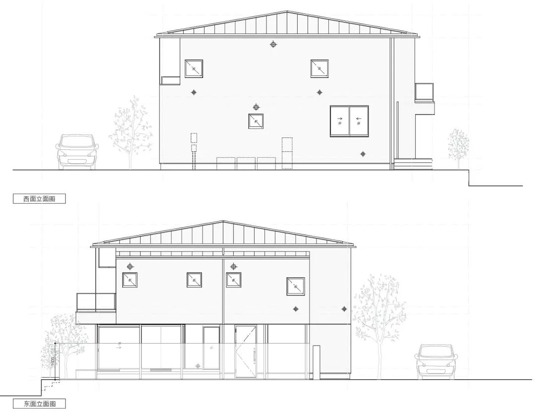 建造方面,住宅以最节约成本的方法,采用混凝土地基与日式传统木结构相结合的形式,由经验丰富的工匠负责把控,他们将所有材料进行编号、组合,在2天的时间里即可完成主体的搭建。整个外观呈现出简约的状态,外立面被灰色的水泥外壁板覆盖,如同一颗自然界的石头般,有着优美的肌理。传统的“人字形”屋顶,借由巧妙的双层屋檐收口,被隐藏于视线之中,与周围的房子形成有趣的对比。