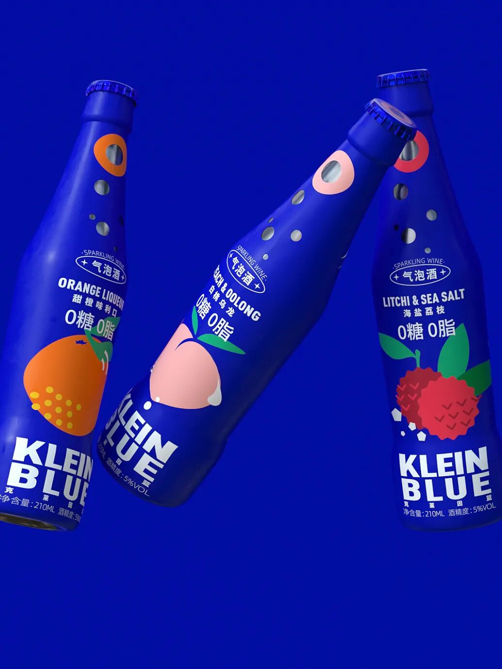 OCD甲古文创意基于年轻化市场出发,设计出一款轻松有趣的气泡酒,符合现代年轻人群追求"O糖O脂"健康快乐水的新消费趋势。从一抹天真纯洁的“克莱因蓝”入手,打造出一款好玩又有趣的气泡酒。
