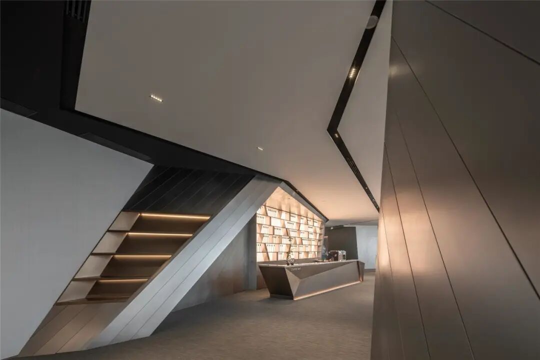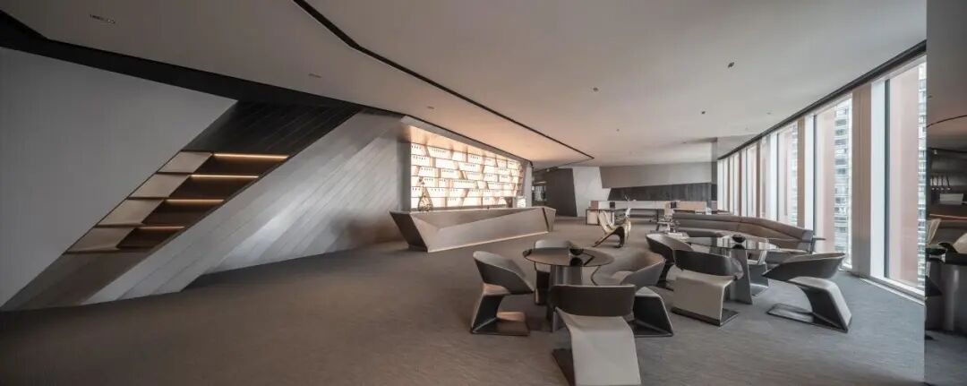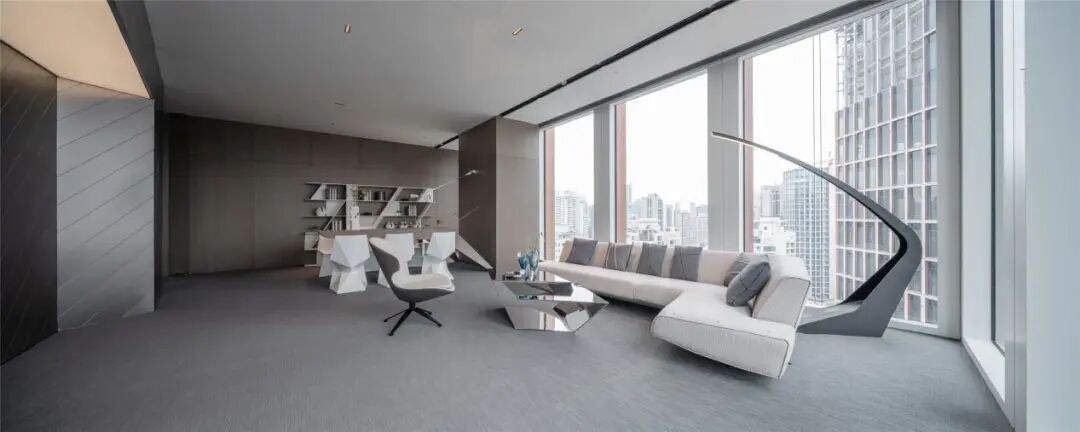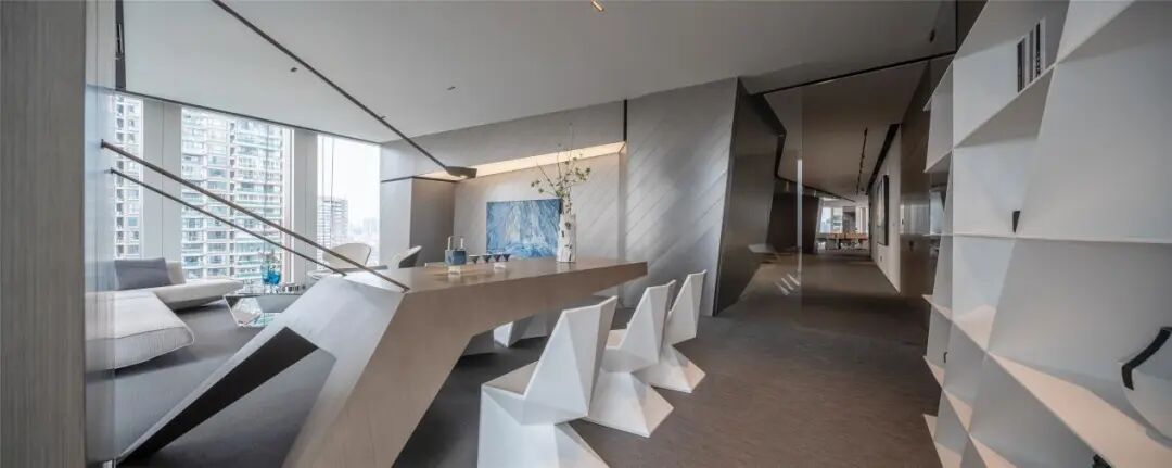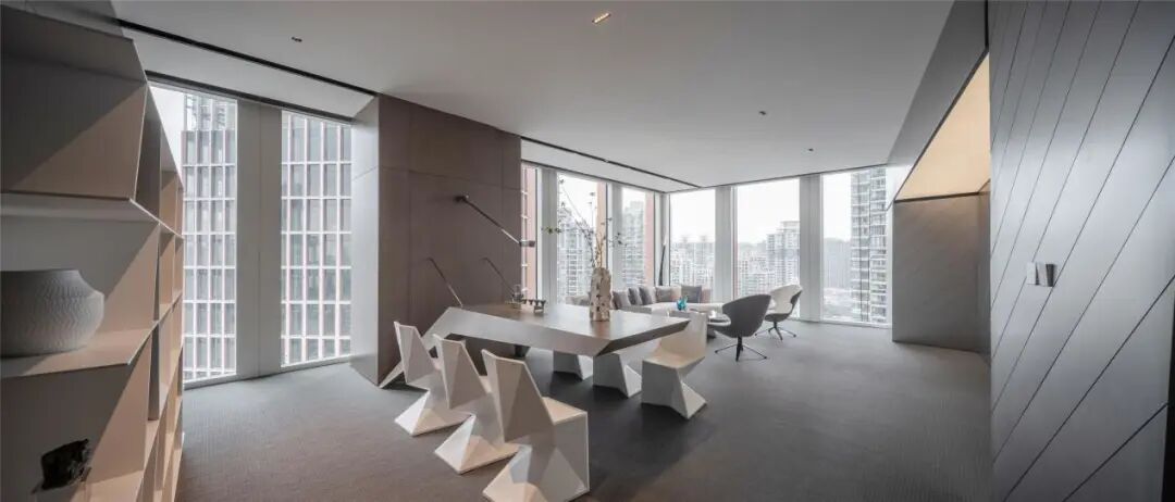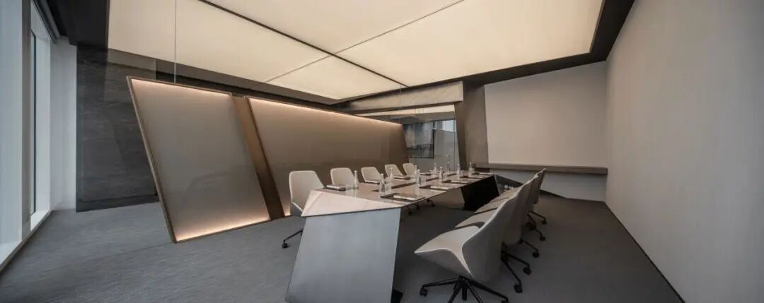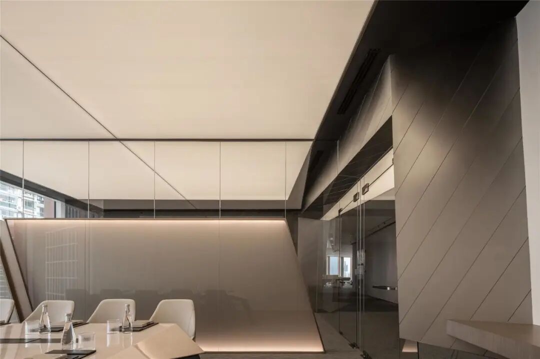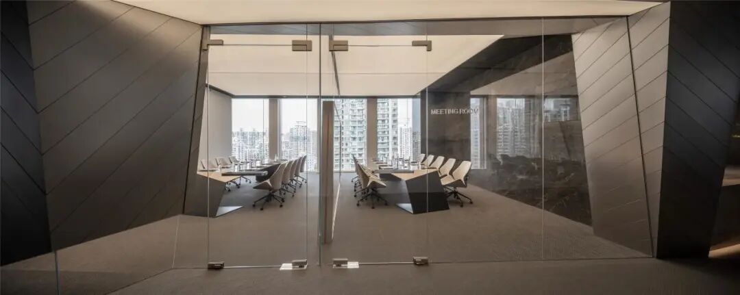 室内空间的界定,利用体块与线面形态进行划分。不规则多面体的运用,使雕塑的概念在空间中延续。大面积超白玻璃代替厚重墙体,轻薄的线条边框隐匿其中,会议室的物理分区体量被减至最小。超白玻璃承载了功能划分的同时,也模糊了空间的界限,还原了绝佳的城市天际线风景。