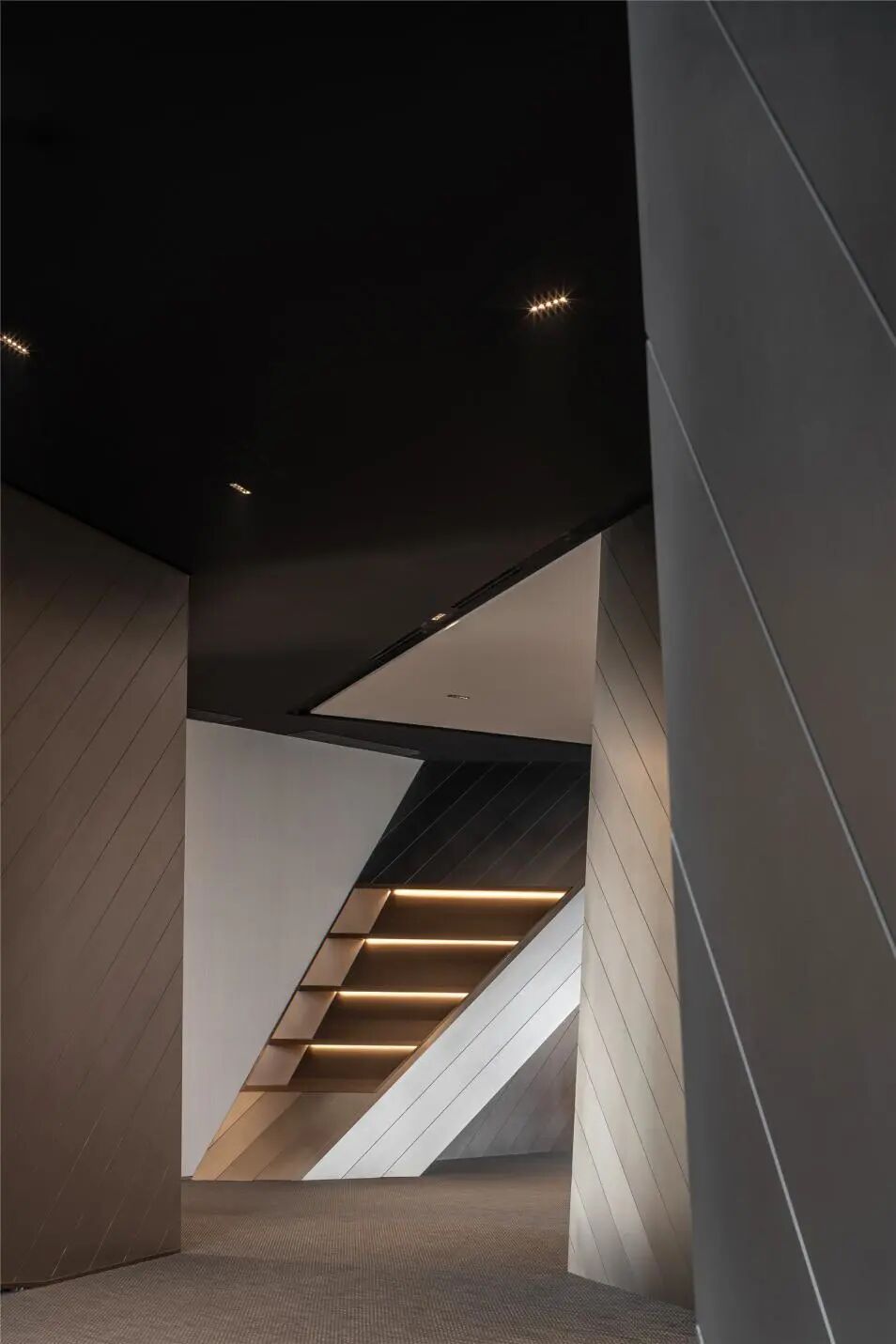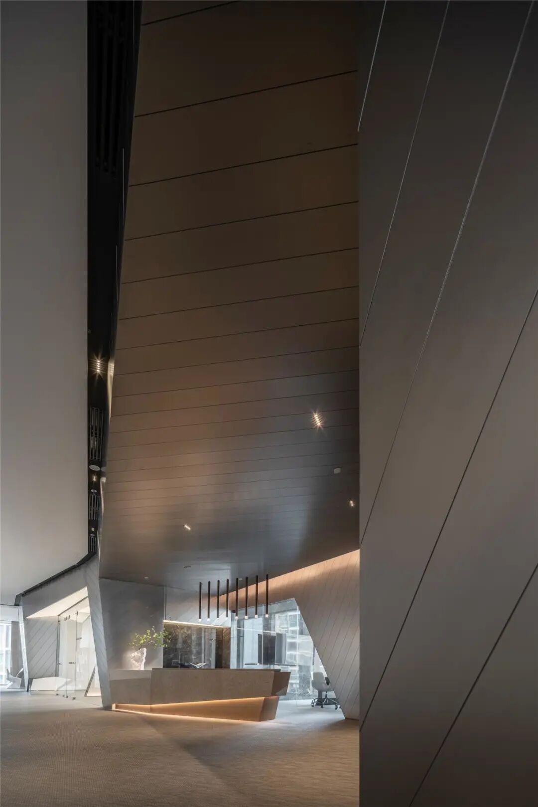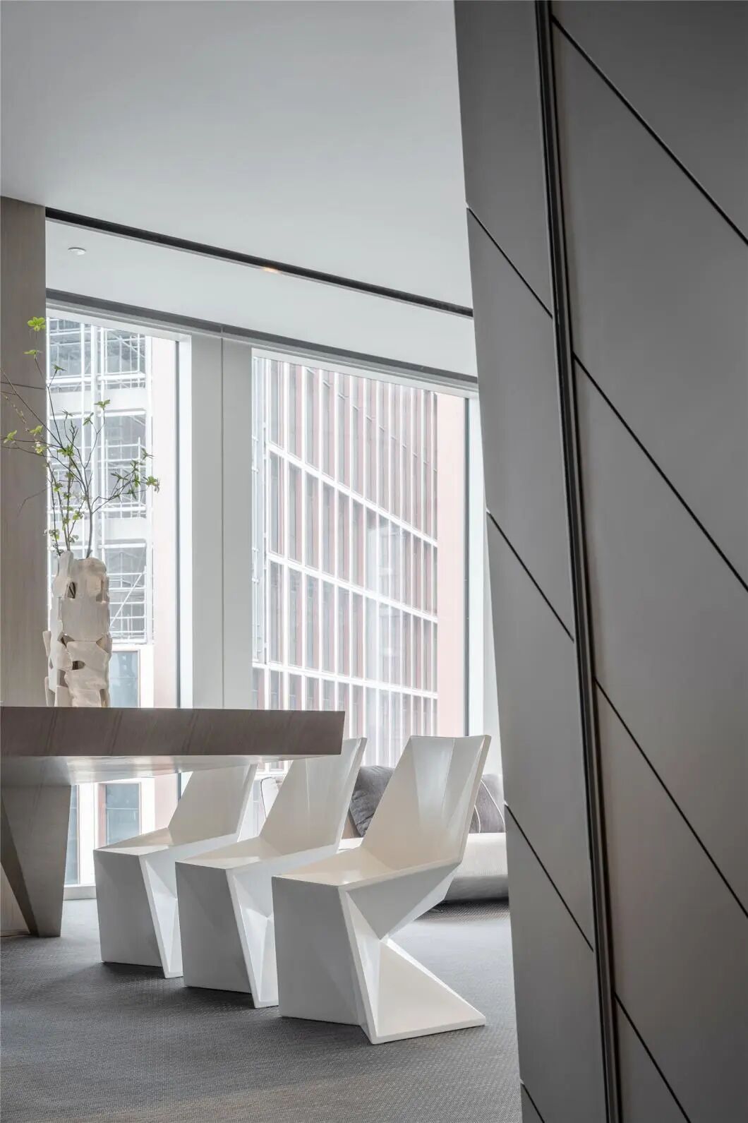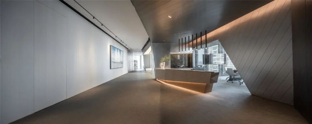 室内空间的界定,利用体块与线面形态进行划分。不规则多面体的运用,使雕塑的概念在空间中延续。大面积超白玻璃代替厚重墙体,轻薄的线条边框隐匿其中,会议室的物理分区体量被减至最小。超白玻璃承载了功能划分的同时,也模糊了空间的界限,还原了绝佳的城市天际线风景。
