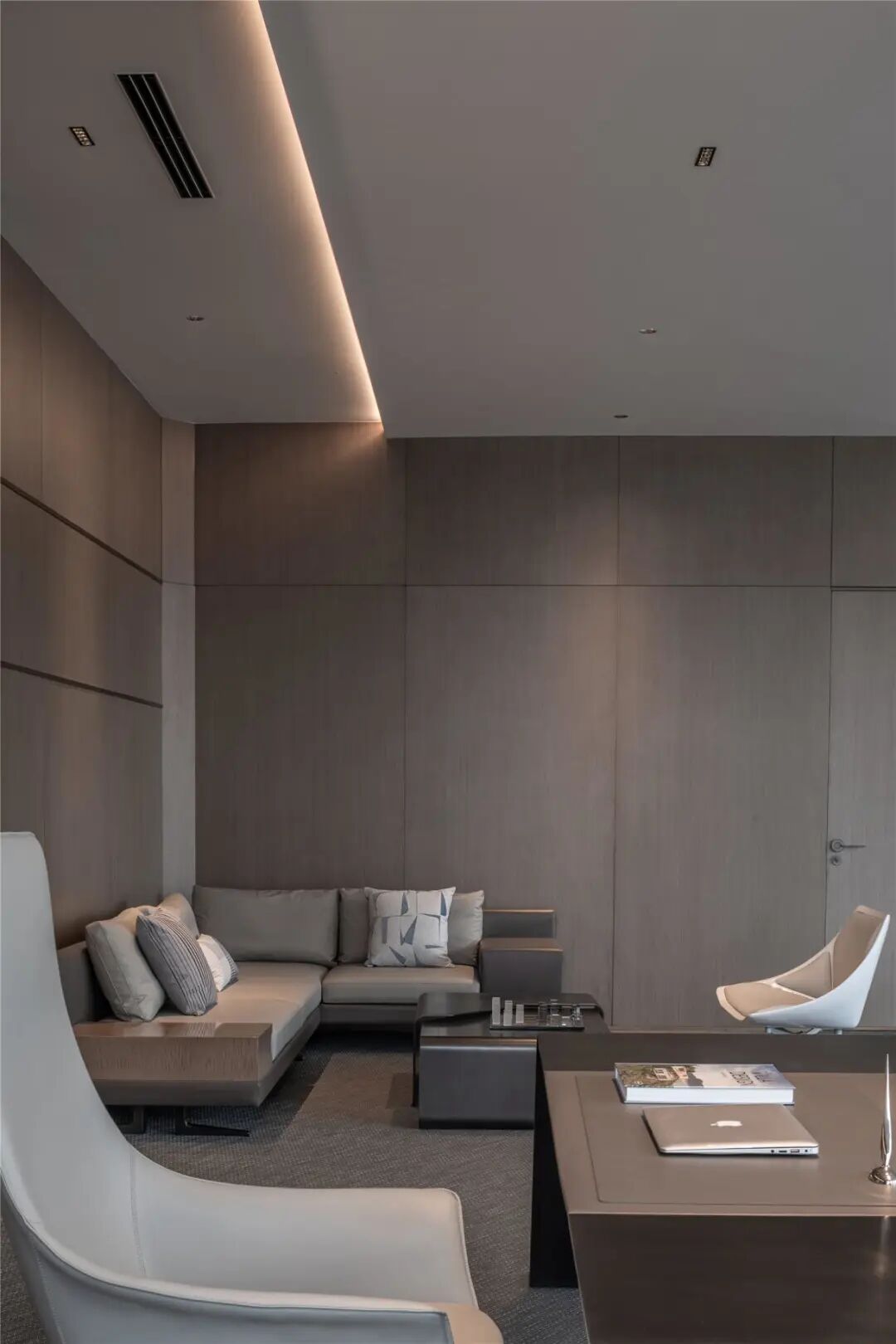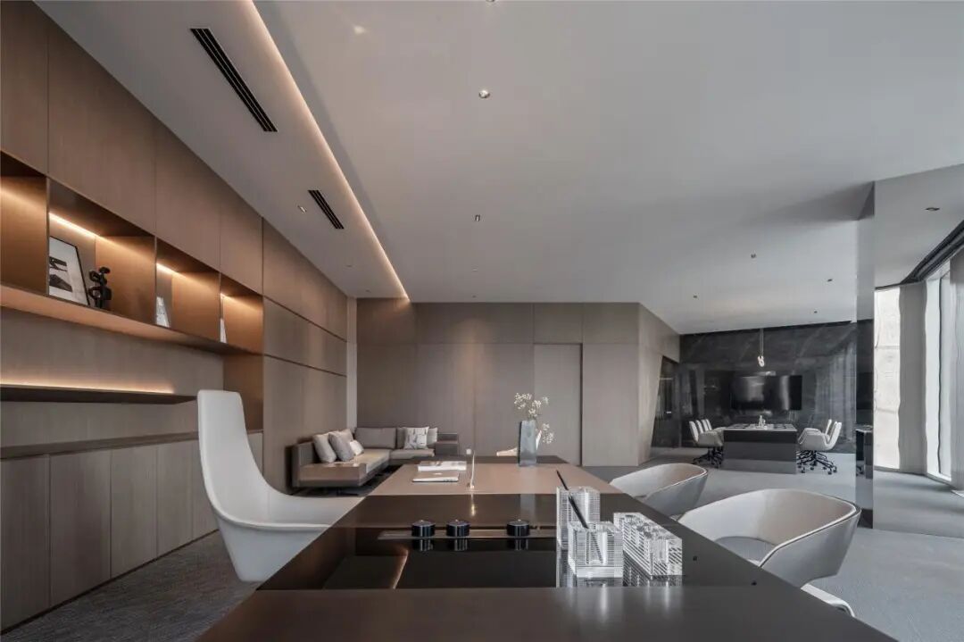 总裁办公室承载了办公时必要的社交属性,要在满足私密性的基础上尽可能的开放空间。摒弃一切繁琐的浮华,用纯粹的材质融入日常的舒适感。皮革承载着丰富而厚重的纹理,利落的线条丰富视觉,营造出大气优雅的氛围。