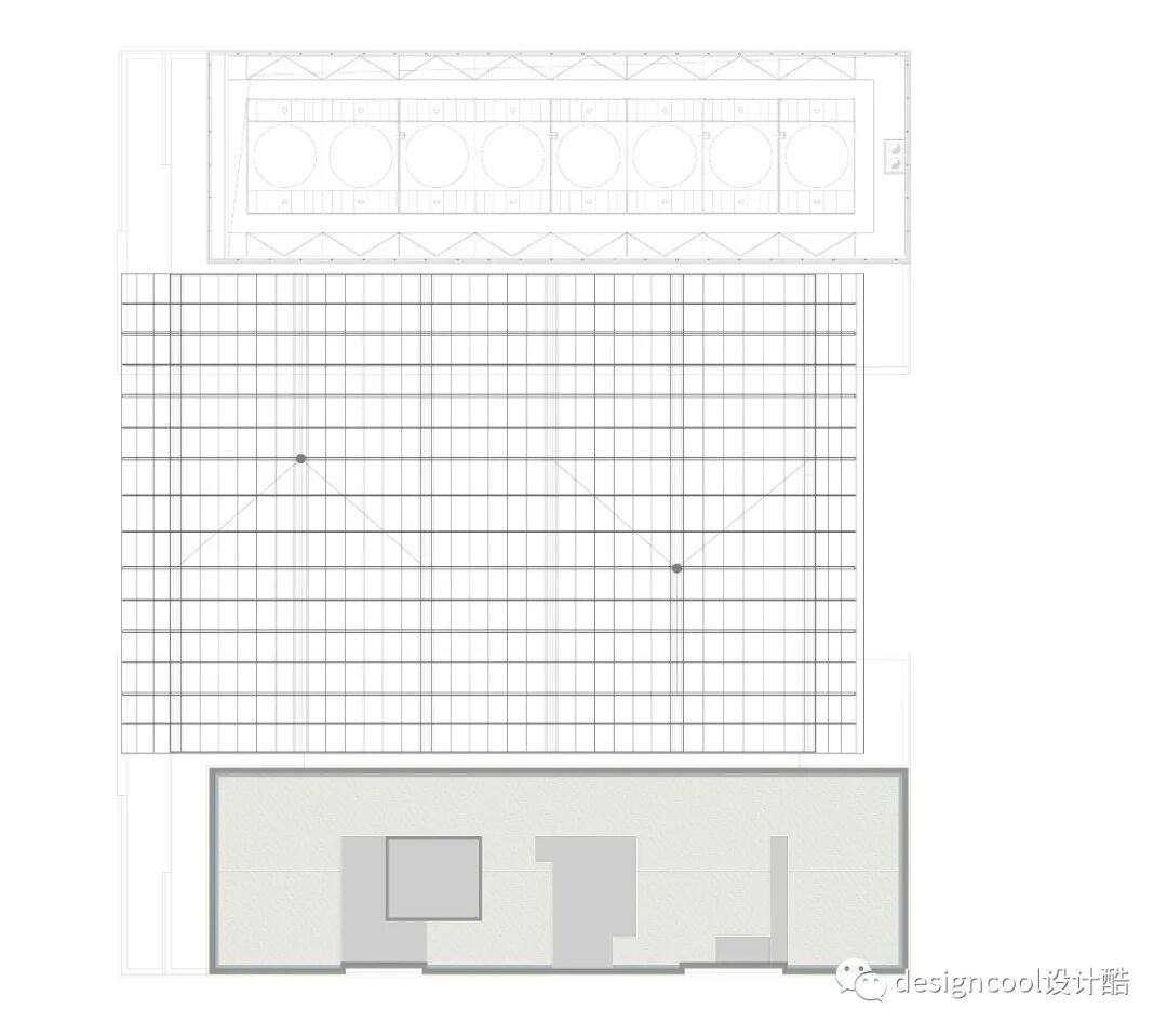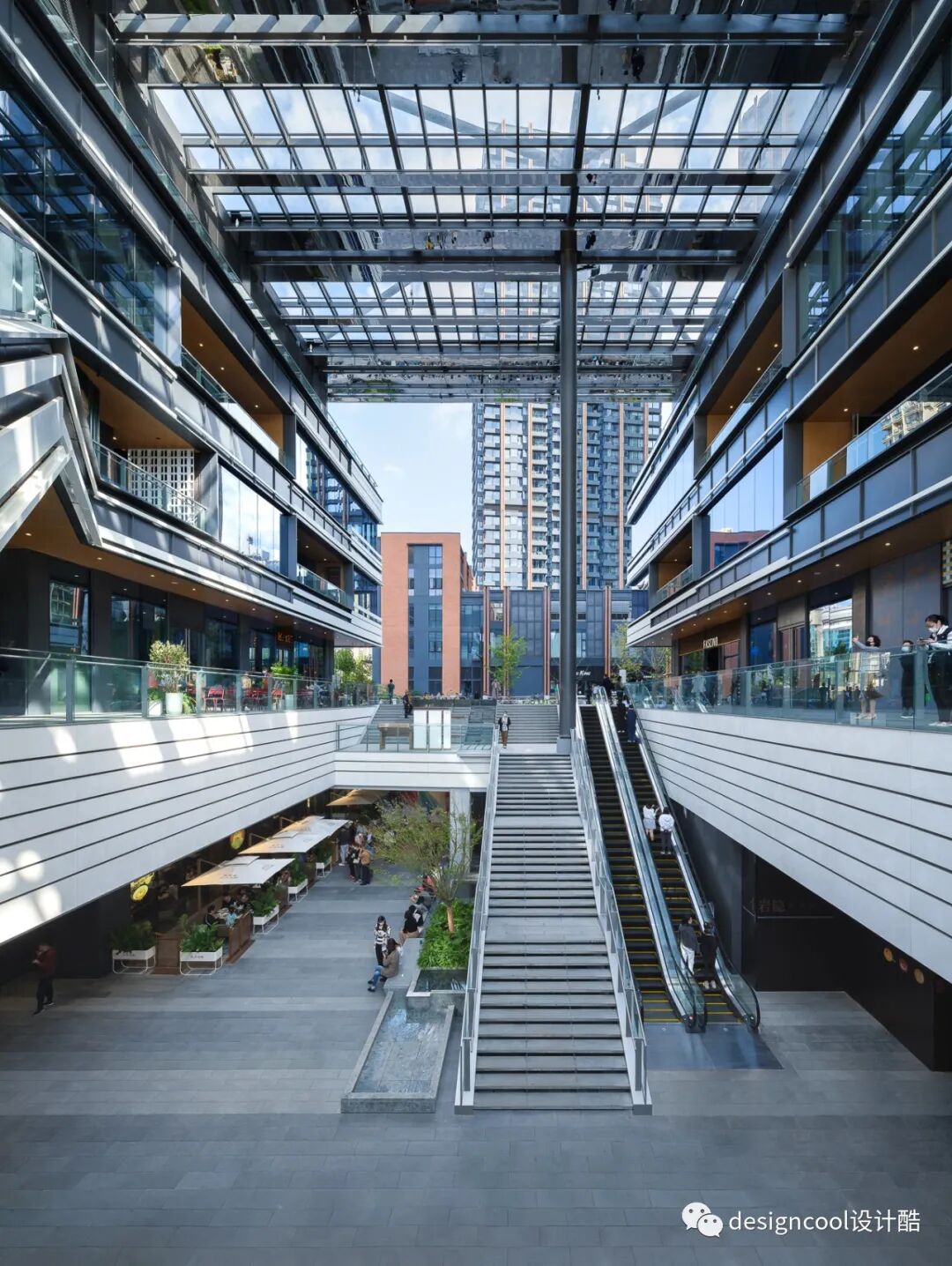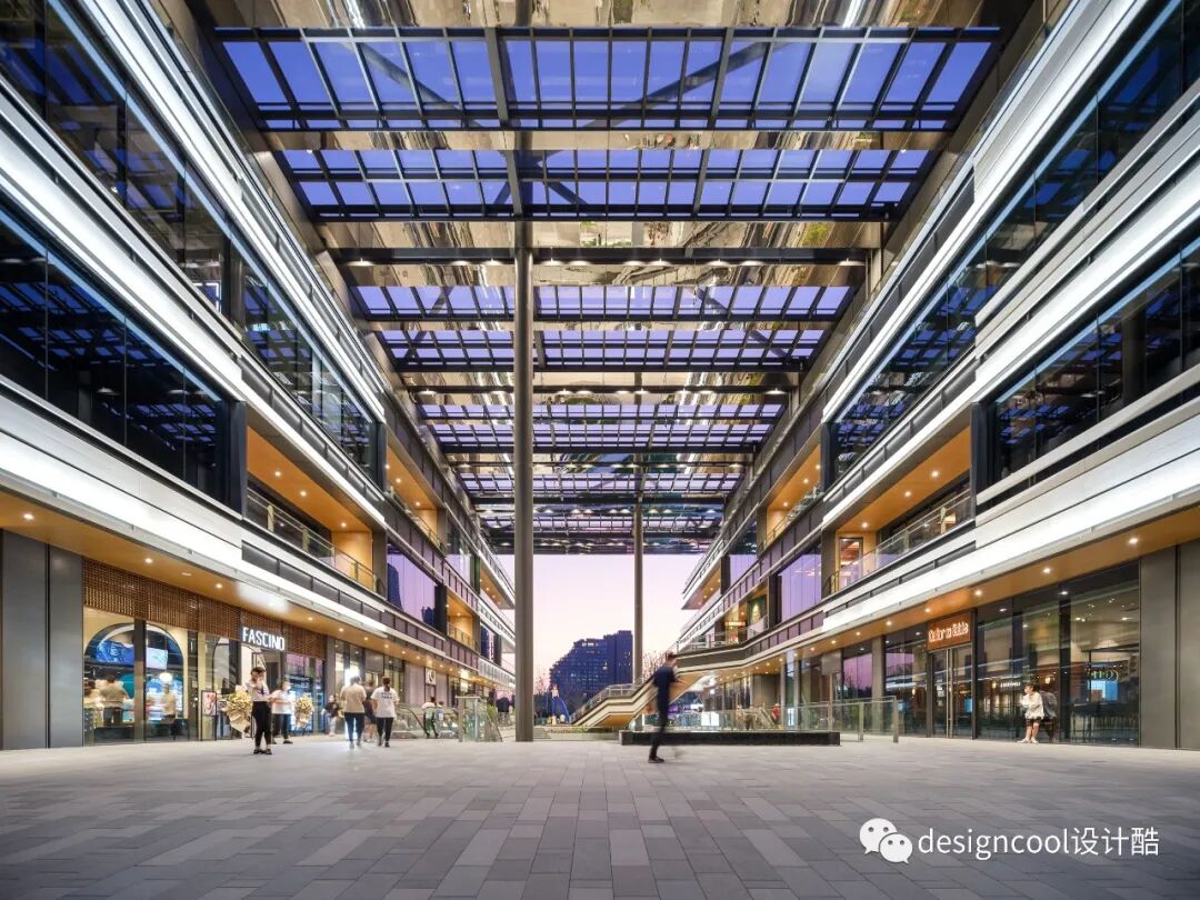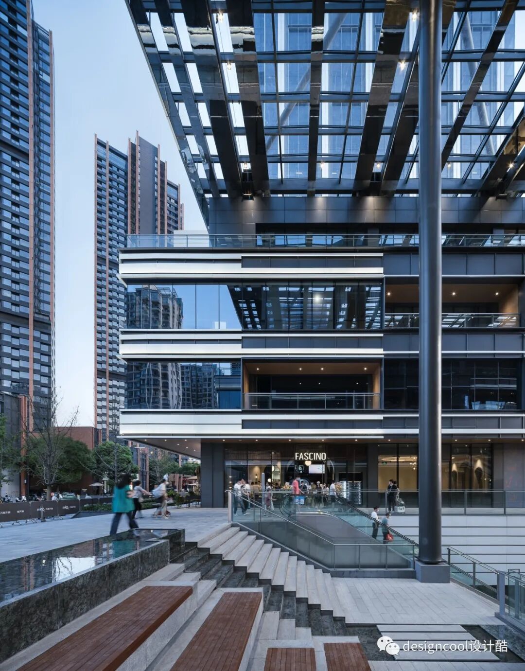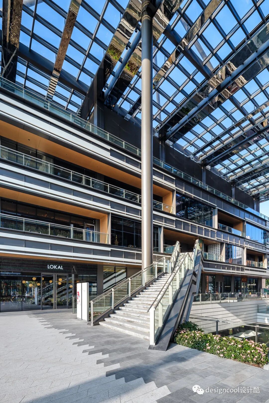 Foster + Partner设计的塔楼采用了三联体的形式:由中间的垂直玻璃中庭相连接的双塔。Kokaistudios的东北角建筑首先呼应,将架空的玻璃屋顶横跨两座四层的建筑结构,塑造出水平向延伸的巨构空间,以此来限定公共空间与地下商业峡谷的联系;其次,这个对称的秩序形式和整个万象天地的其他地面建筑遥相呼应——轴线对称的天后宫戏台和慎余里的鱼骨状肌理,让公园中的城市建筑具有了形式上的共鸣。