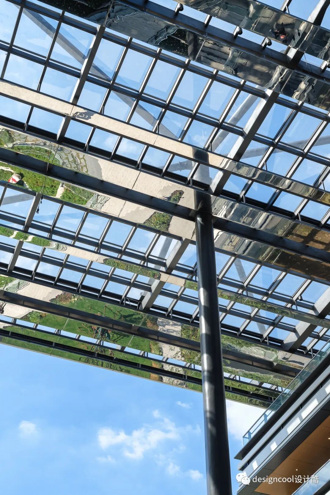 Further emphasizing the verticality of this newest side building and linking it to that of the main commercial space are two pillars extending from top to bottom. Here they support a canopy of roof glass that both echoes the materiality of the nearby office tower, and also floods the central space with natural light. Enhancing this effect, reflective louvers on the inside of the ceiling structure quite literally mirror visitor activity below, bringing the underground structure and ground-level greenery together with the city to interact in a theatrical way.
