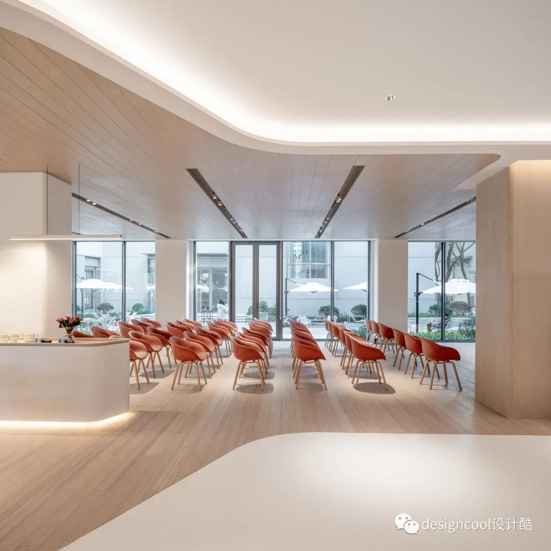 来访者从此处穿过连接第二和第三栋建筑的连廊,通向大型休息室,途经显示品牌社区活动的照片墙,引导用户前置感知社区温度。除此以外,它还包含了吧台和用餐区,为用户提供愉悦和轻松的提车体验。