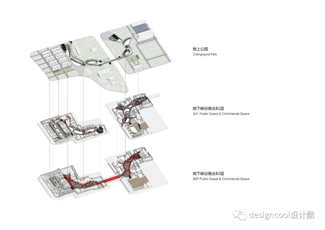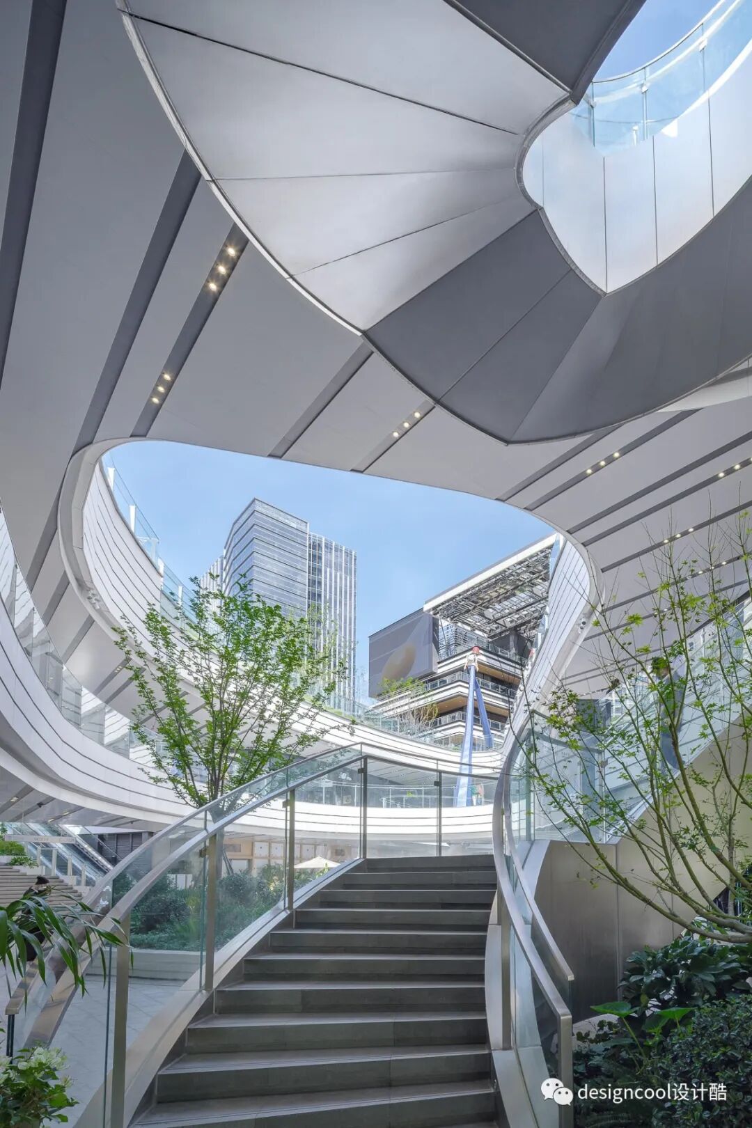 地面上设置了六个“峡谷洞口”,使公共绿地与商业空间互为风景。洞口的曲线自然流畅,结合满是绿意的台地过渡到商业的共享空间,从而模糊了地上与地下的界限。