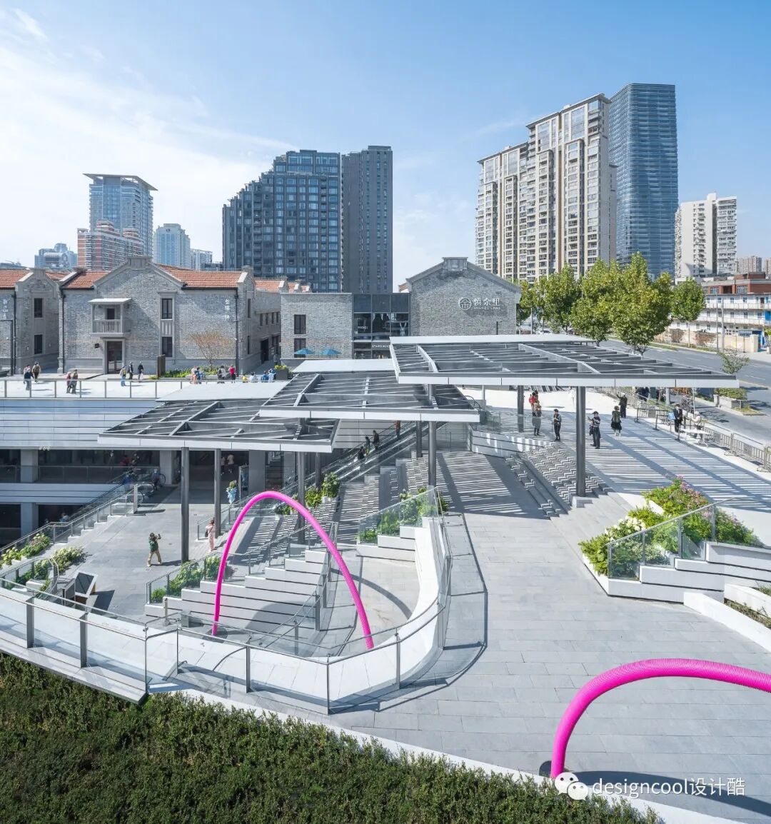 Taking a holistic approach to the project, Kokaistudio’s vision was that of an urban valley. The commercial space is located inside the valley; while its sides take the form of stepped access points. As well as a new 4-floor ‘gateway building,’ the project’s most important and unifying element is the aboveground green land itself. An attractive public space for local residents and visitors alike, it injects welcome greenery and fresh possibilities into this previously overlooked corner of Shanghai.
