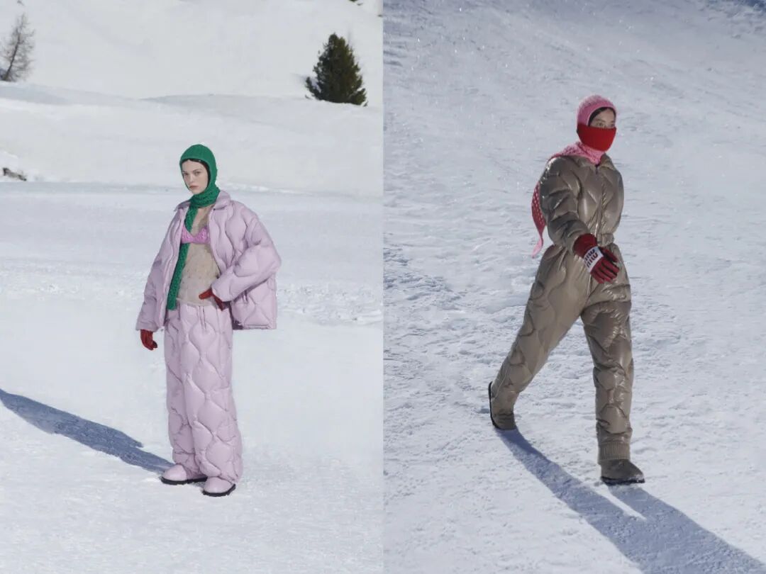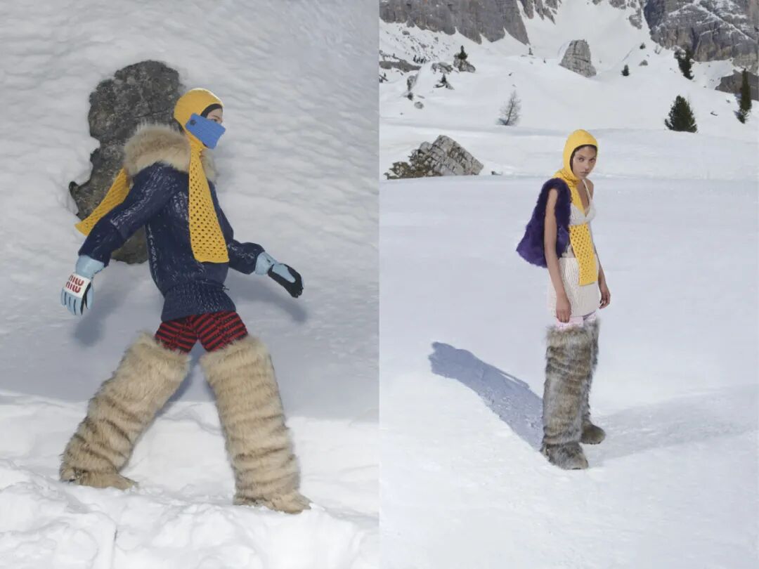 这两年的秀场绝对少不了滑雪元素的身影,Miu Miu的2021秋冬系列,正是一个为所有爱冰天雪地的女孩准备的系列,滑雪面罩换成了针织材质,雪靴也都披上了皮毛,是属于浪漫天真怪女孩的雪场装备。