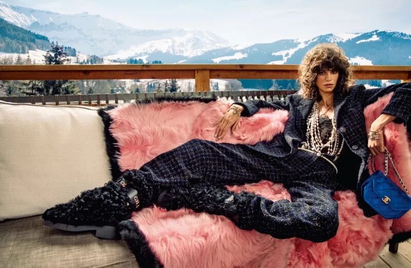 Chanel的2021秋冬系列,也拥抱滑雪文化,法国来的贵妇们,穿着斜纹软呢、蹬着皮毛雪靴躺在阿尔卑斯上边的度假小屋里感受雪场气氛。