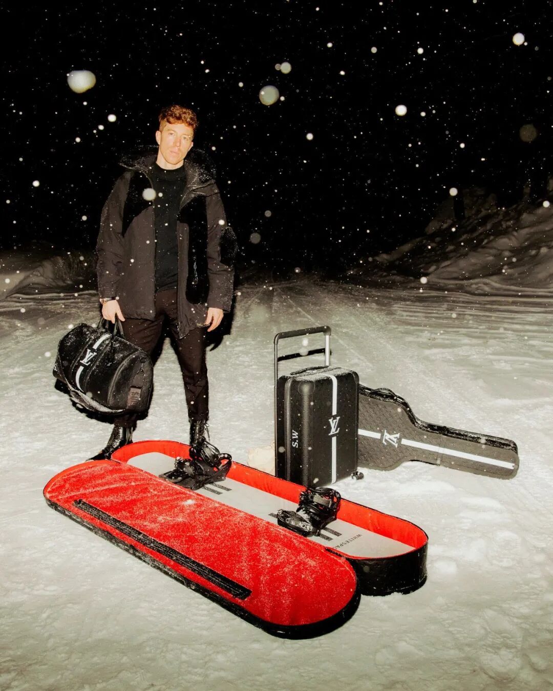 前面说的那位带着全套LV定制装备的运动员便是Shaun White,这个套装包括雪板箱、旅行袋、行李箱,还有一个吉他箱(因为他同时还是一名乐队吉他手),六位工匠花费数百工时手工打造,传奇人物的出场排面一下子拿捏住了。