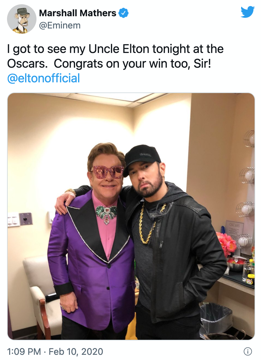 两个人的友谊一直持续到了现在,Eminem送过Sir Elton镶钻的情趣礼物,还在网上为他的Uncle John摇旗呐喊。