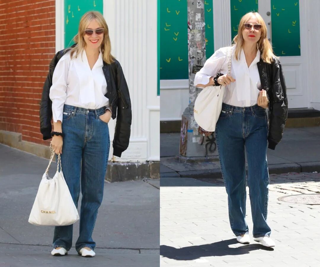 Chloë Sevigny的夏季穿搭公式=白上衣+牛仔下装+白色乐福鞋+肩挎大包。