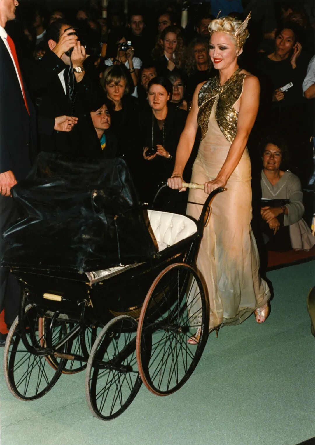 Madonna为Jean Paul Gaultier走过不少次秀,1995春夏推着婴儿车带着翅膀头饰告诉你天神也得自己遛娃。