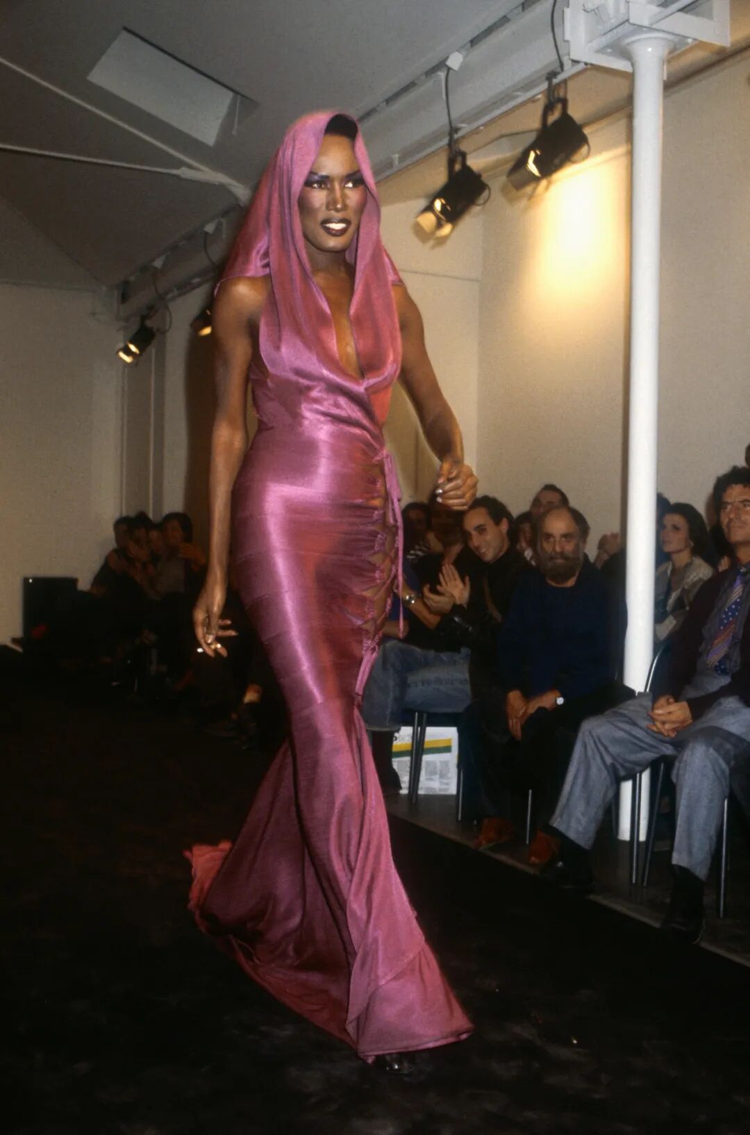走秀的时尚icon不老少,能成为时尚史最知名moment的似乎第一个想到的只有Grace Jones。Alaïa 1986年的春夏高定秀场,Grace Jones身穿一身连帽礼服走下T台,神秘、魅惑的形象成就了这一身造型。