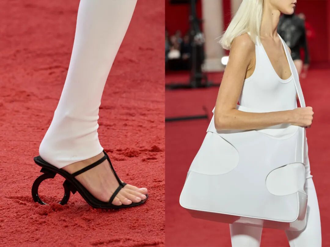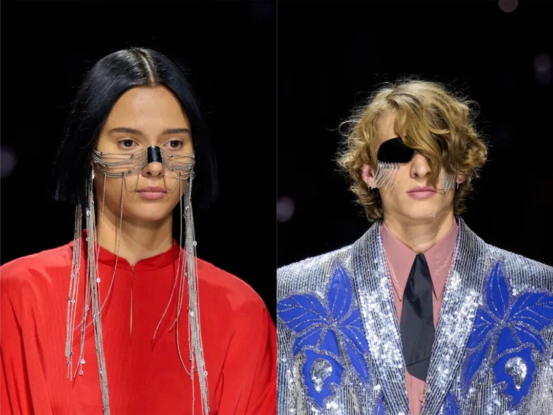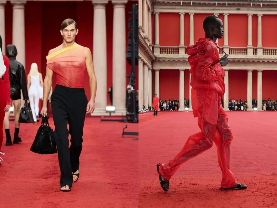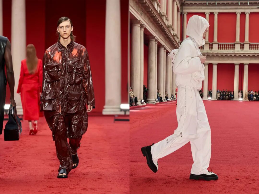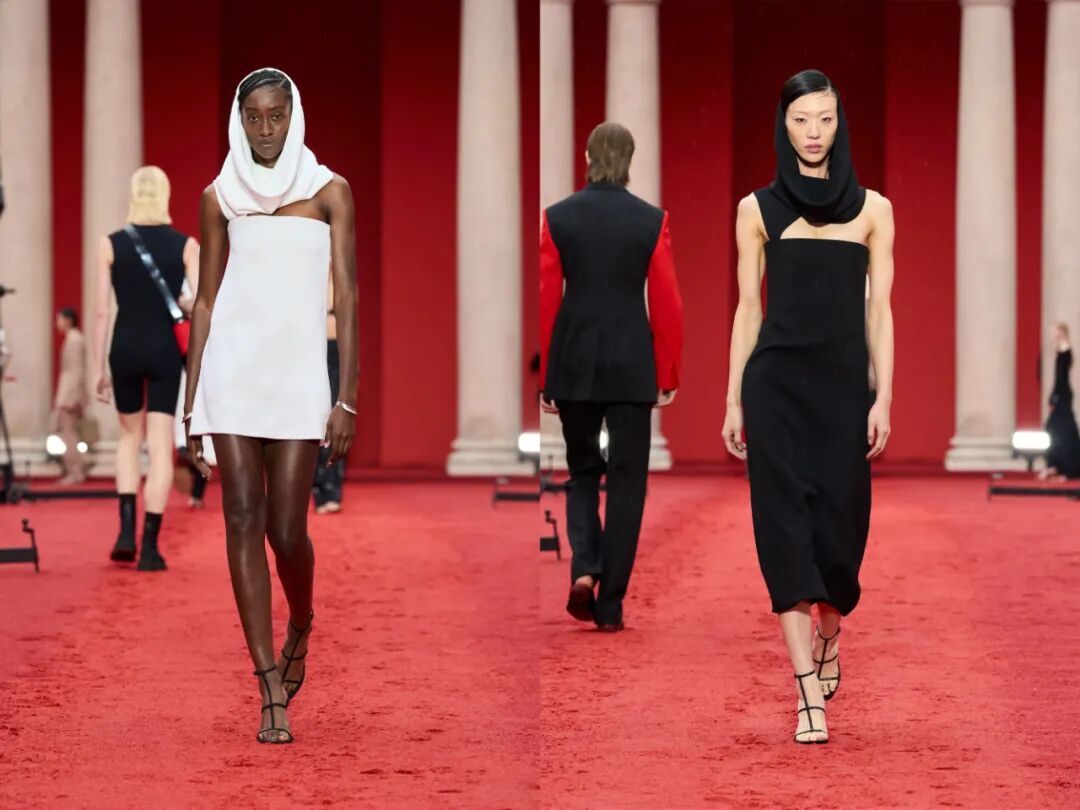 设计师Maximilian Davis加入菲拉格慕后的首场大秀,就大刀阔斧地为品牌改了名字,显然现在的名字更加简短好传播了。在保持品牌优雅的调性的同时,加入了更加有辨识度、有传播力的设计,其中就包括各种帽子的设计,女装的帽子多和衣服连在一起,在通红的秀场中呈现出颇为神秘的异域氛围。