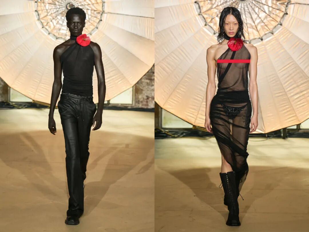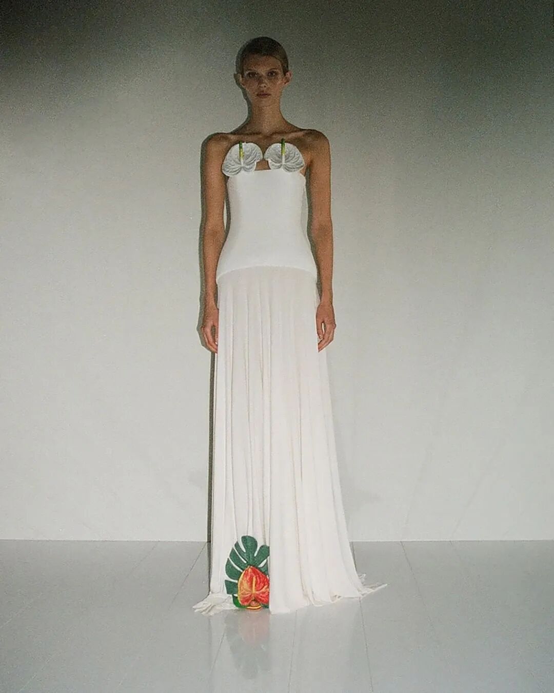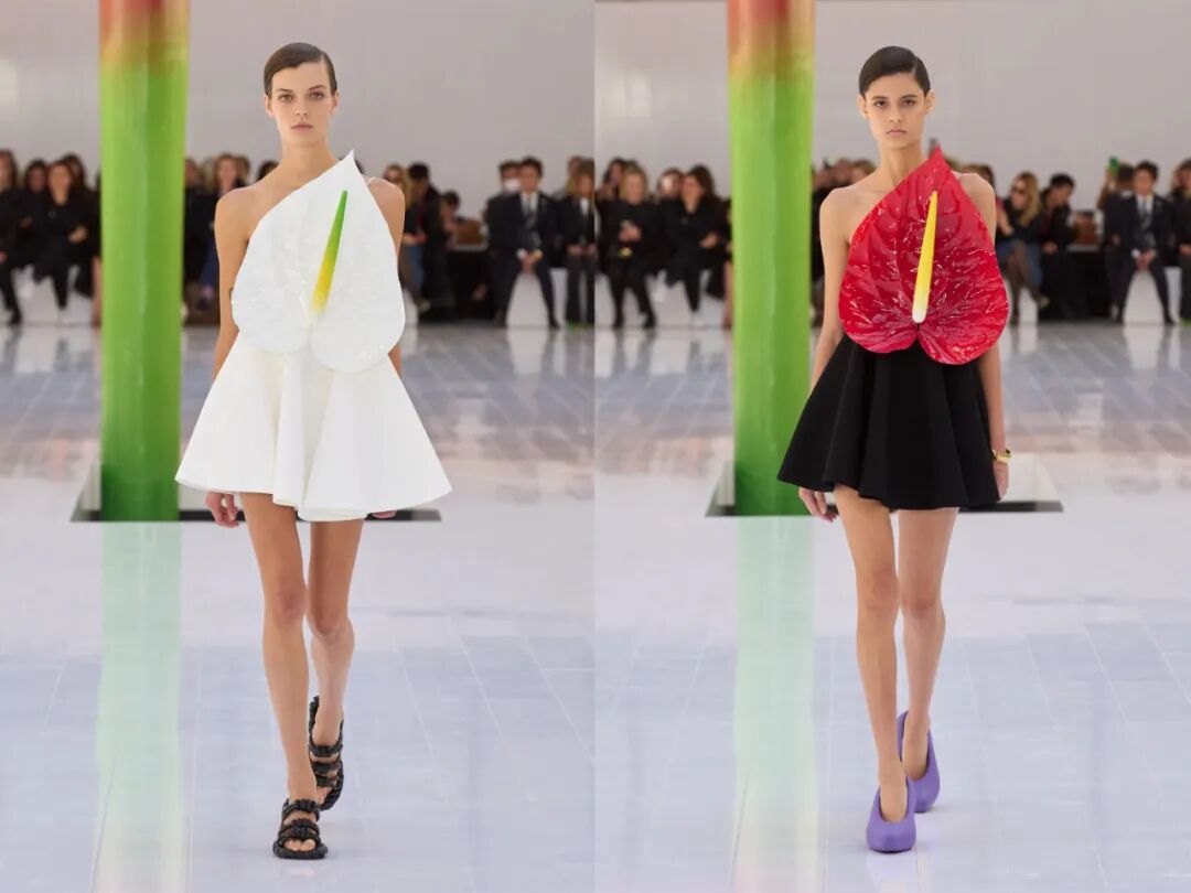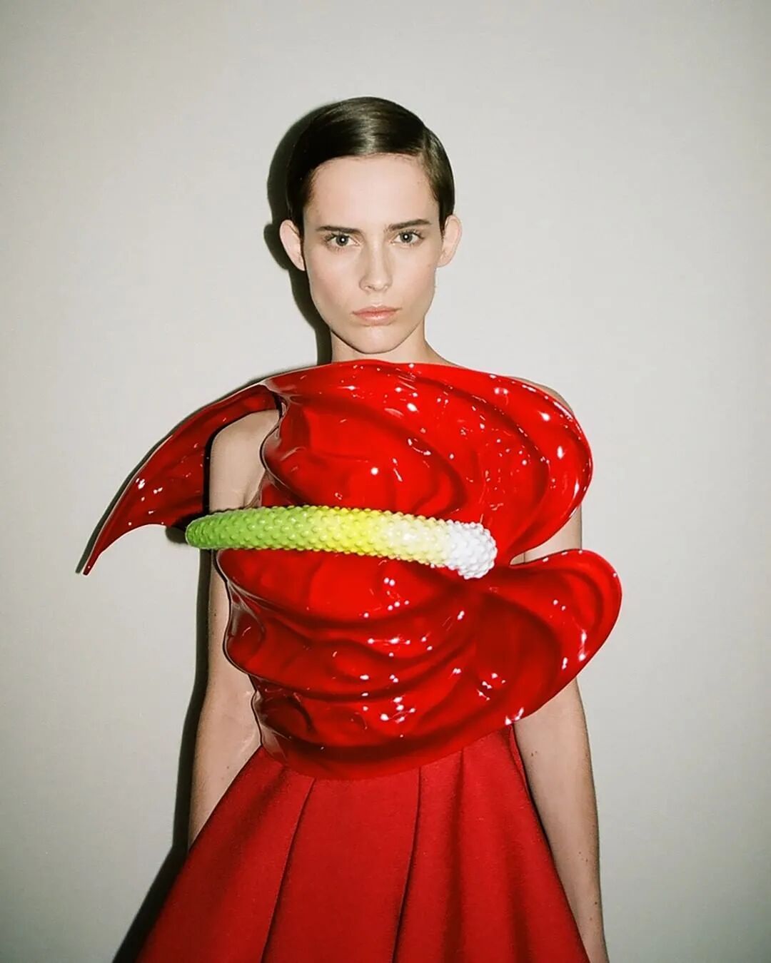 无独有偶的,Ludovic de Saint Sernin在秀场上也选用了花烛作为配饰,别致又张扬。