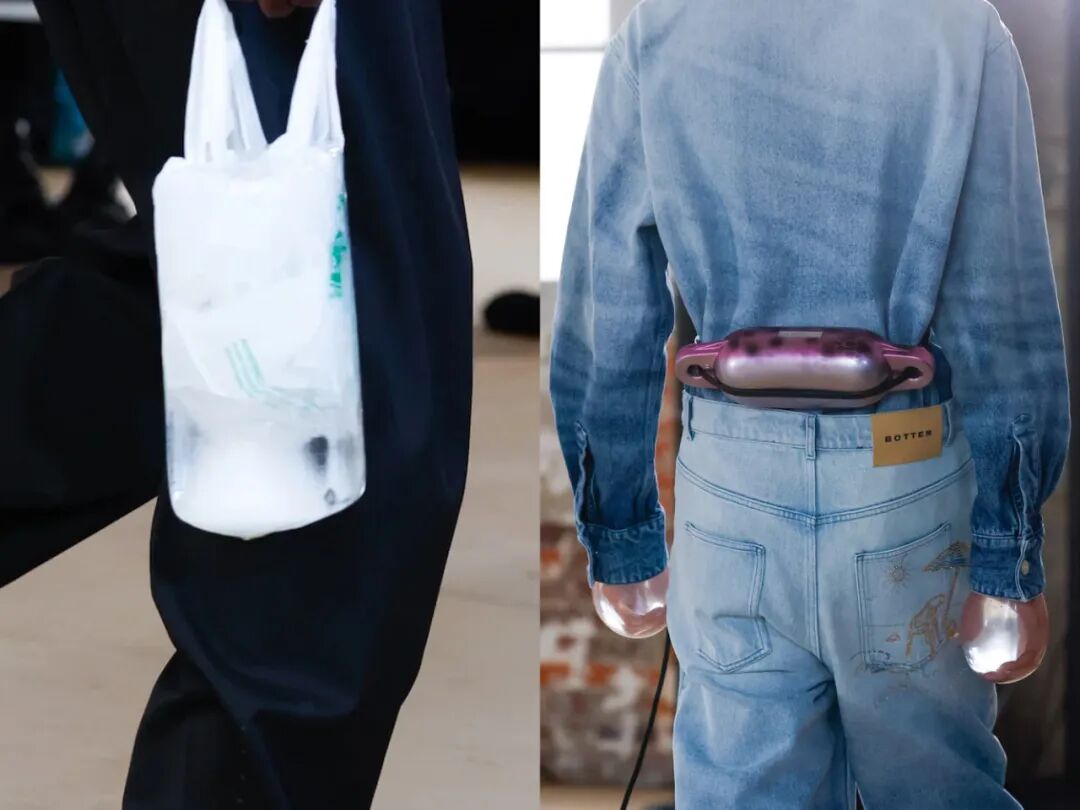 Botter也在这一季玩了些特别的材料,呼应这一季海洋、环保、冰川的主题,冰块包(真的冰块)、塑料袋都有各自警醒的含义。这样的举动也是在告诉设计师们,口号不是一定要印在衣服上的哈。