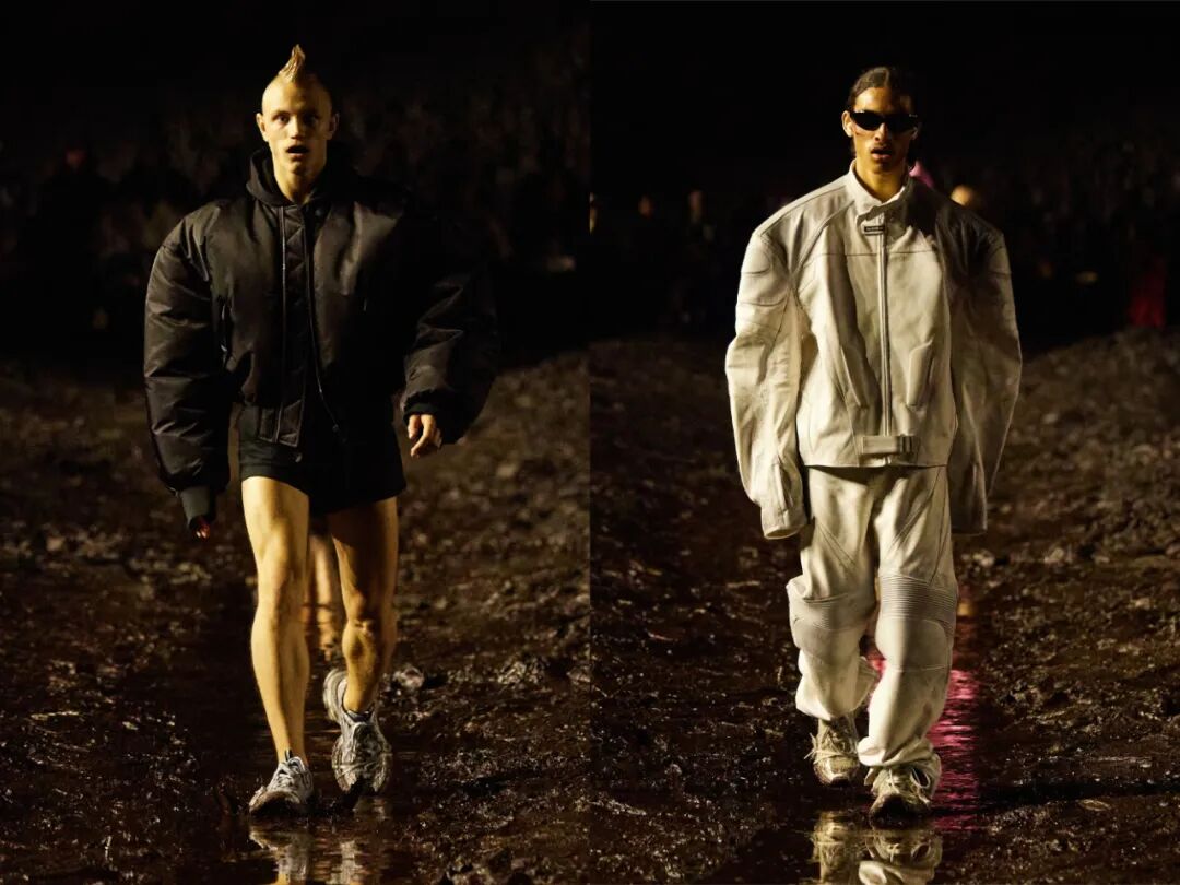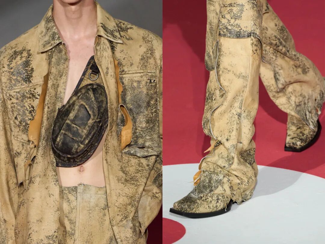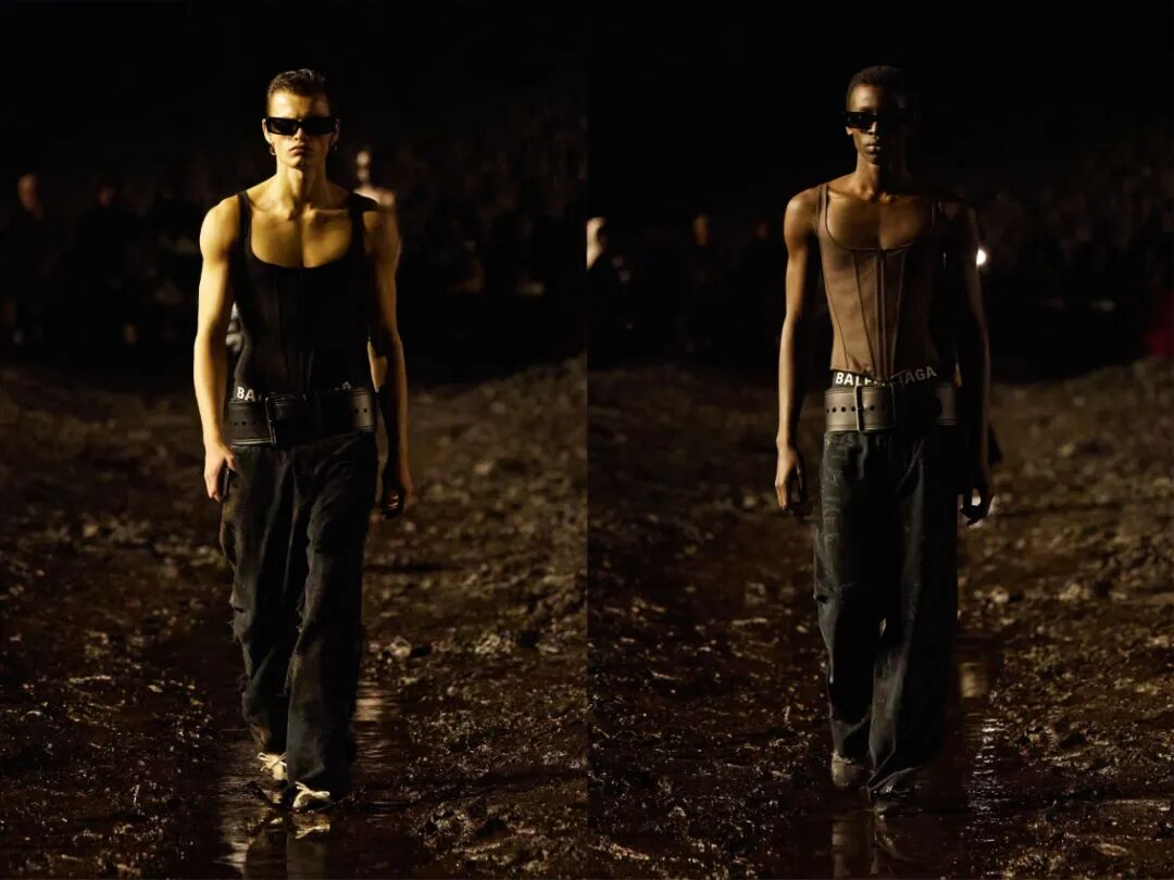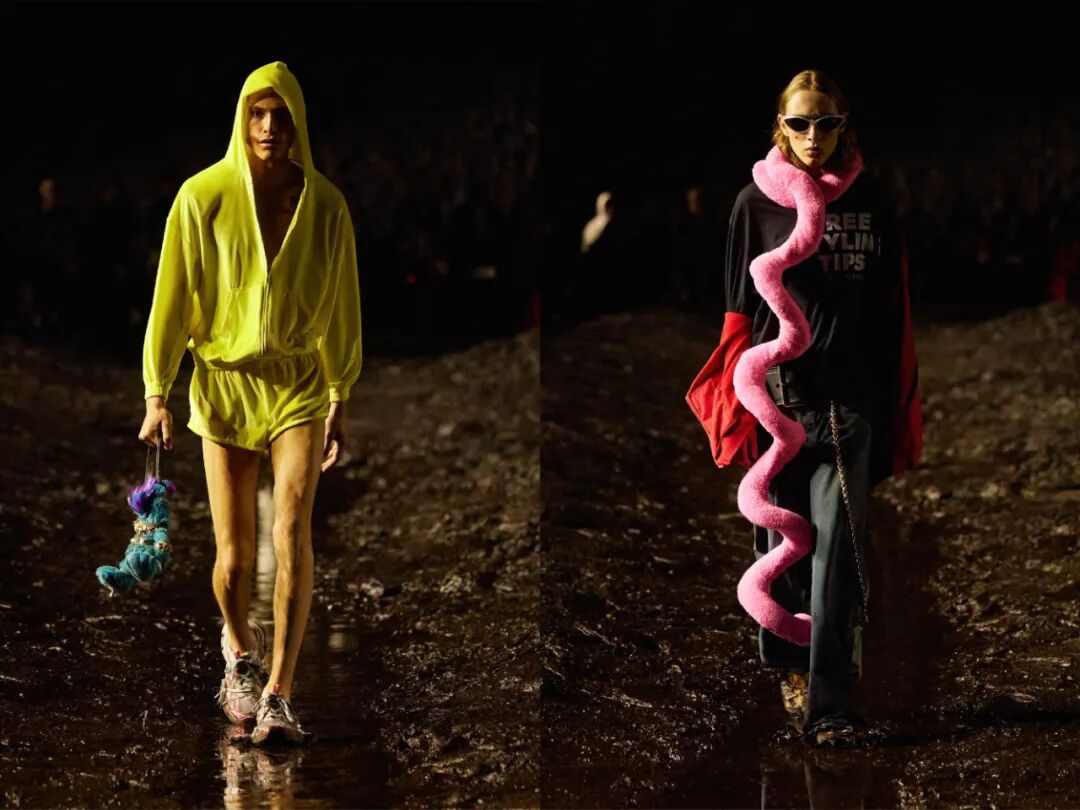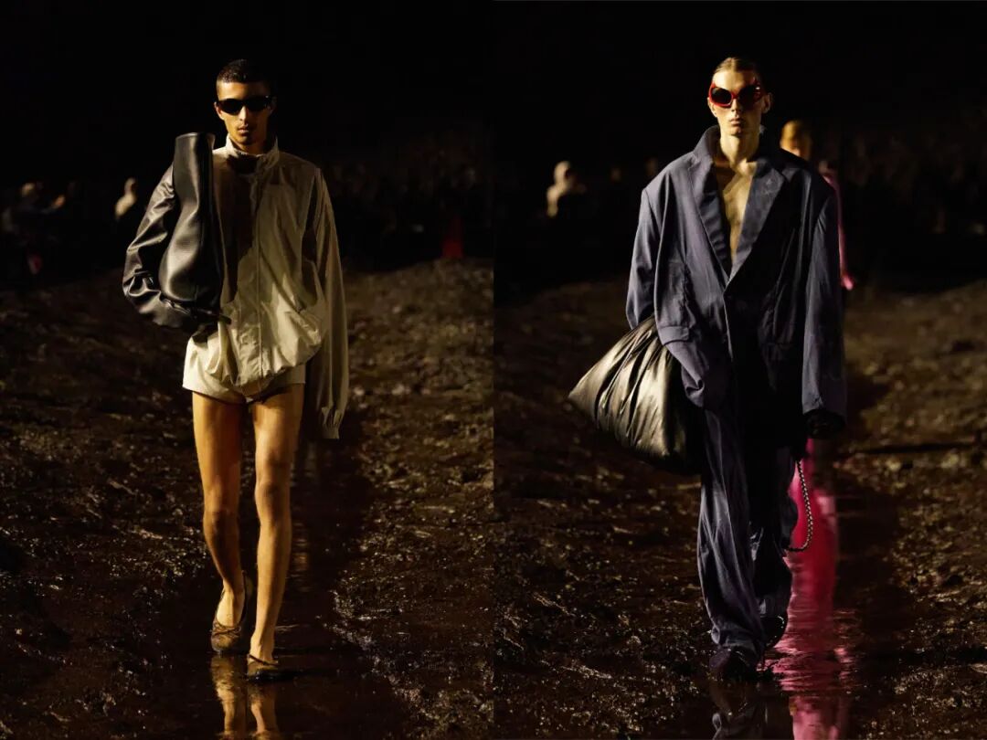 没有人比Demna更懂末世之后,我们该穿什么,这一季的秀场脏到不敢落脚,满地的泥泞,像一个废弃的战壕还刚下完一场暴雨。新鲜出炉的价值不菲的秀款,刚走上秀场就被溅上了一身泥,以为是毁掉,其实是下场的这一刻才算完整。