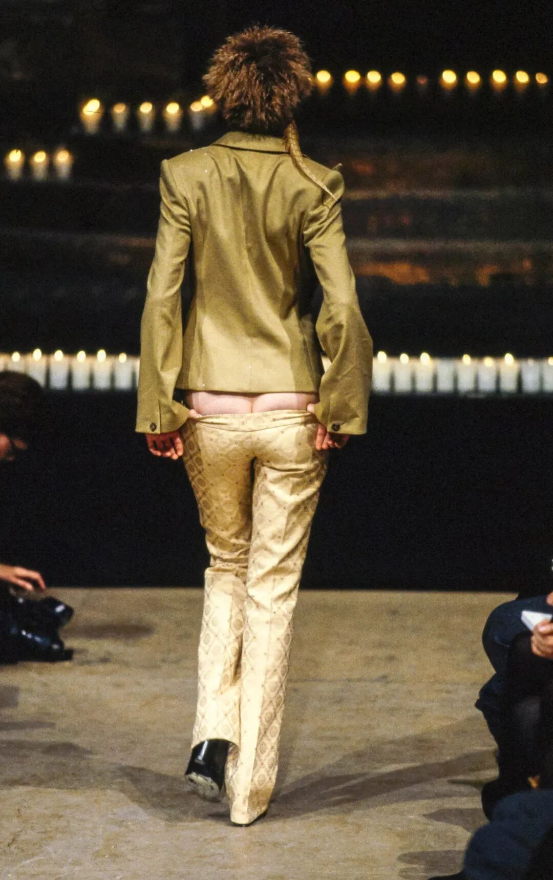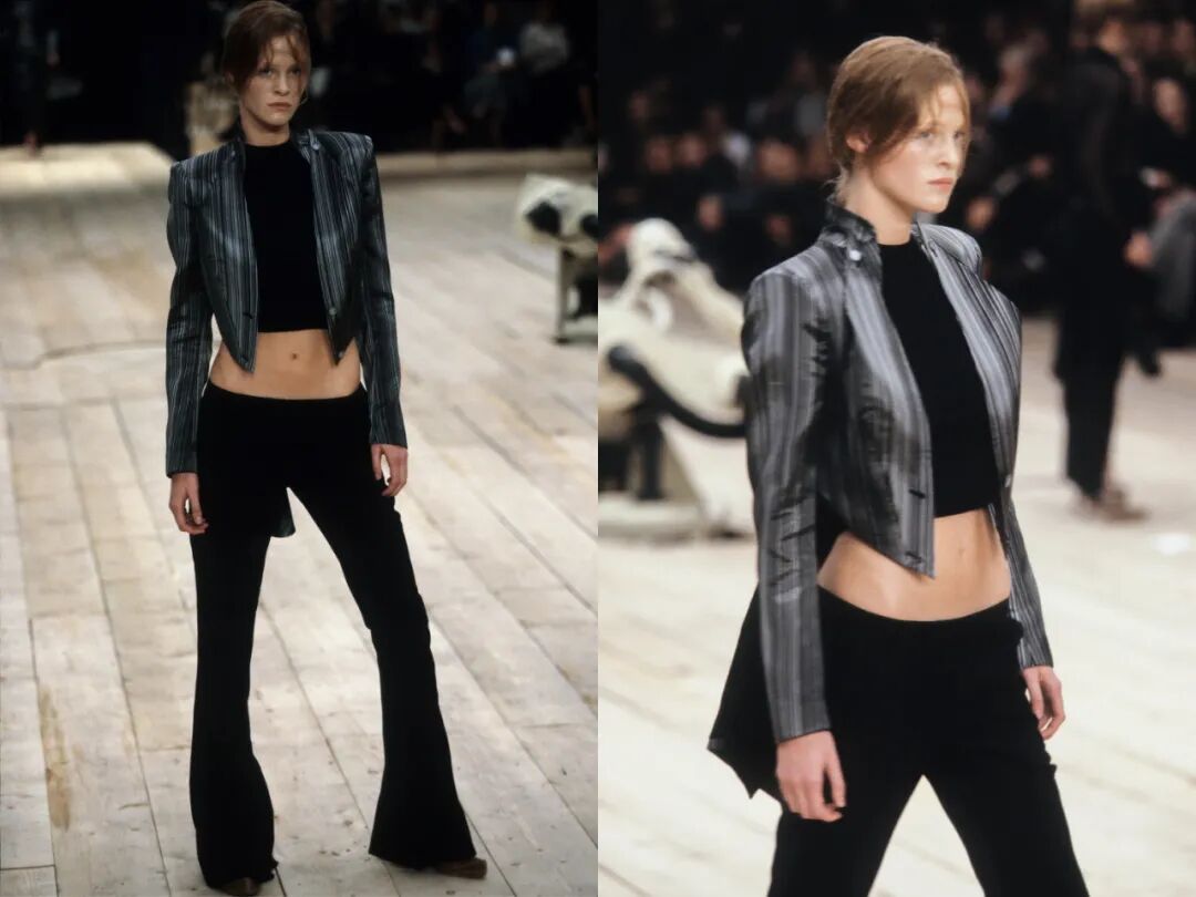 1993年秋冬“Tax Driver”主题秀场,Alexander McQueen推出了他的招牌设计之一“Bumsters”,极限的低腰+露臀设计,性感尺度在挑战着当时无数人的视觉神经。这之后,低腰设计总会在McQueen的秀场上出现。