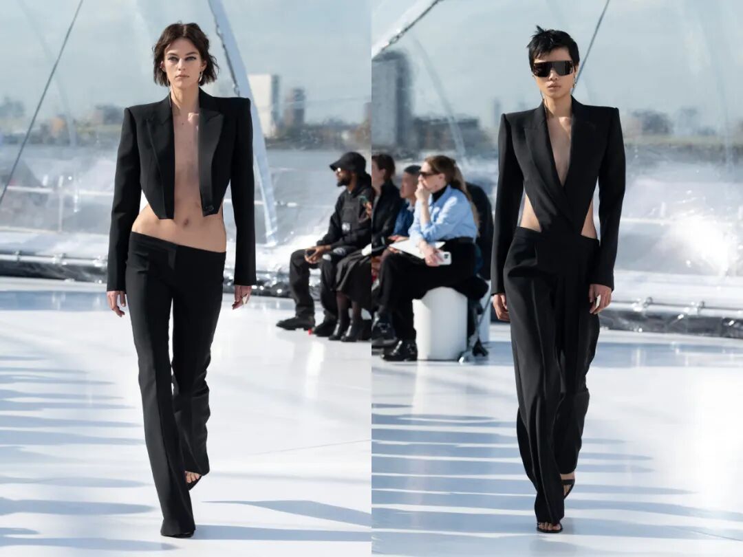 再到2023春夏的秀场,都不说主打千禧辣妹风的Blumarine和DIESEL了,在Alexander McQueen的秀场上,我们也见识到了不少的低腰look。McQueen本人在1999春夏创作的低腰套装被Sarah Burton搬出来致敬,成为属于这个时代的时髦权力套装,