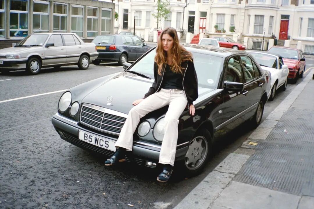 在还没开始走秀前,Gisele就已经被摄影大师Juergen Teller盯上,拍下了这张宝利来相片,还能看出青涩和稚嫩的青春少女气息,黑色帽衫、白色牛仔就像每个青春少女一样邻家。袜子配Birkenstock的搭配方法也是早早被她掌握了。