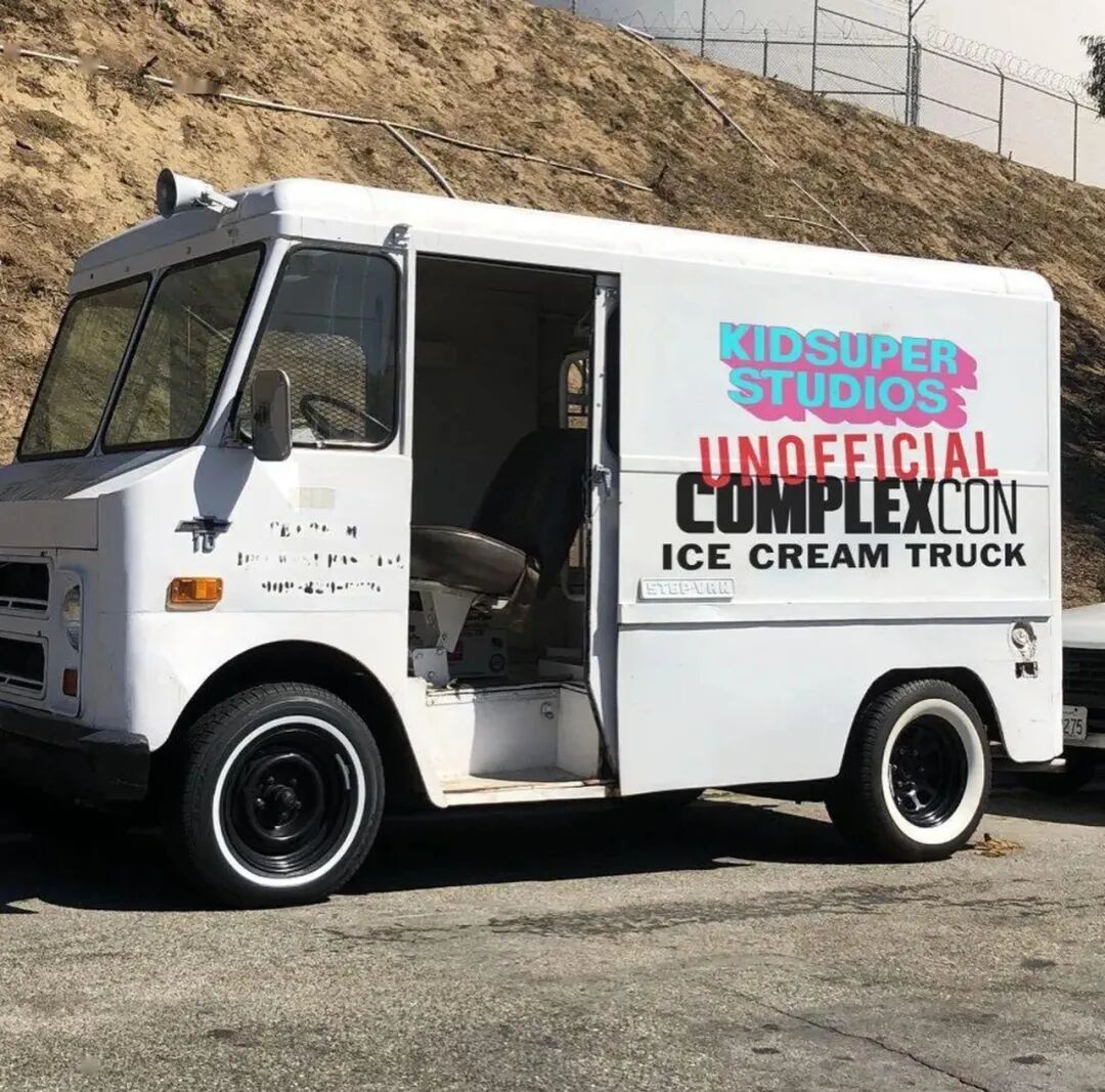 进不了Complex展会,KidSuper在展会外搞了一辆冰淇淋车,实际在卖自己的产品,Colm是懂“蹭”的。
