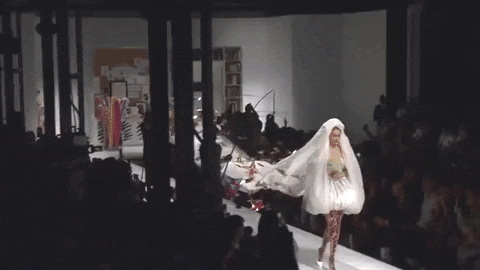 经典的秀场时刻当然不只这些,2016秋冬,超模Anna Cleveland穿着一条“着火”的裙子在秀场摇曳,一连串的表演,打开了走秀的全新思路。