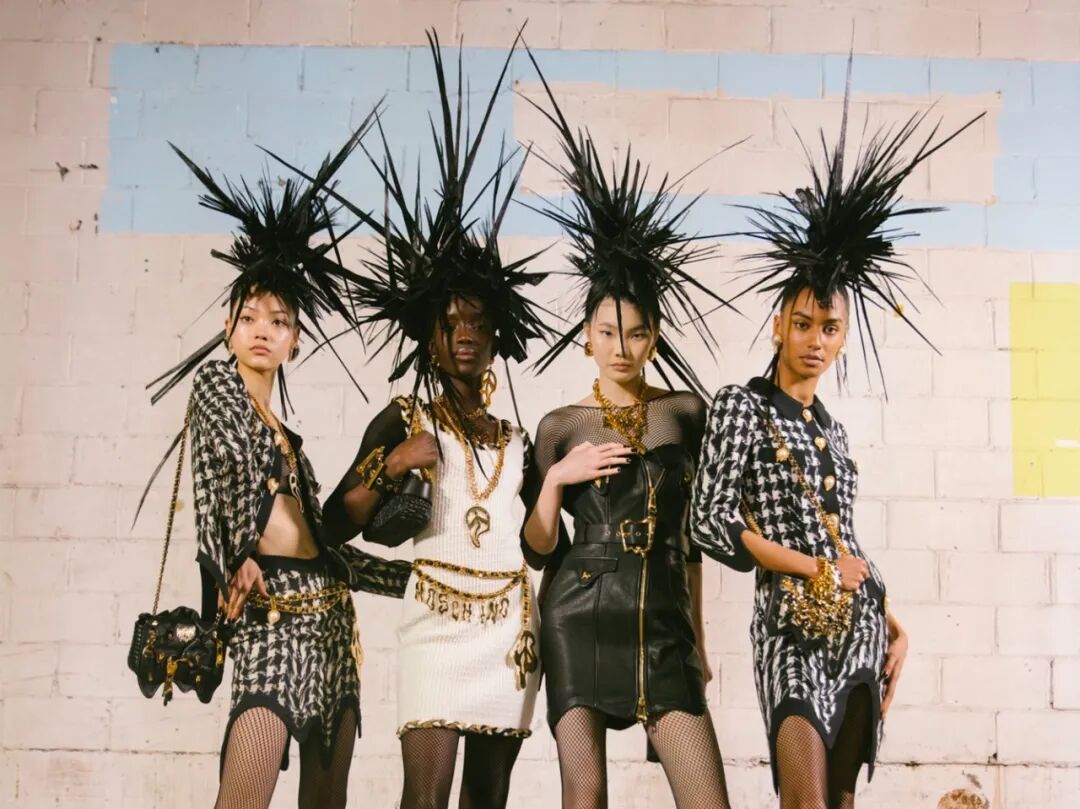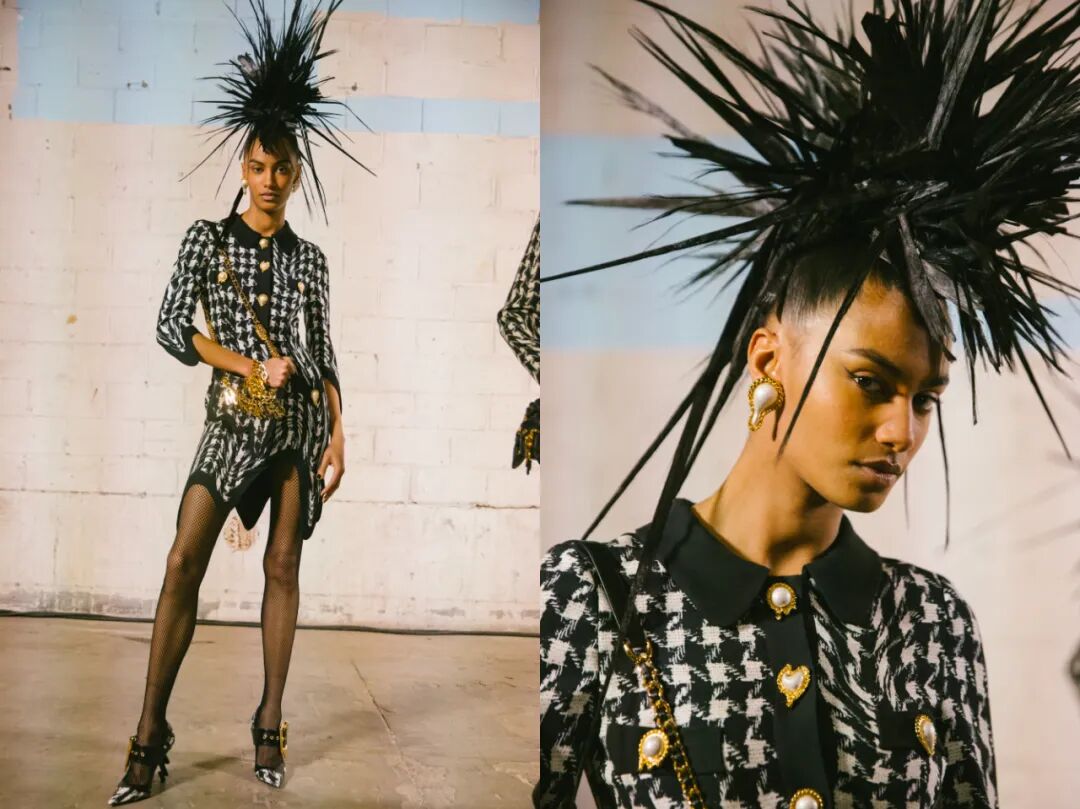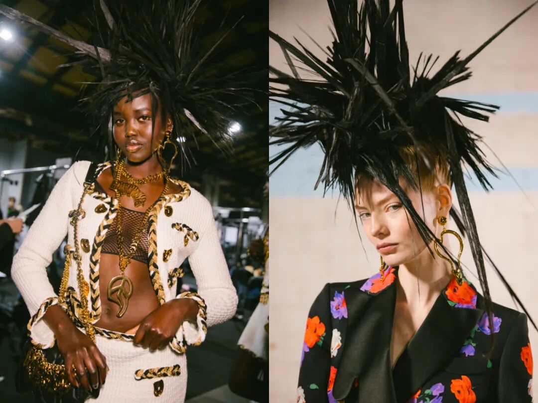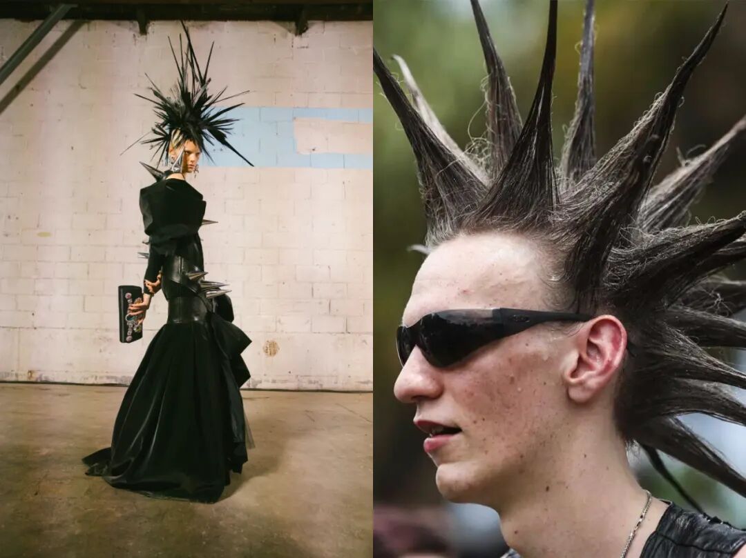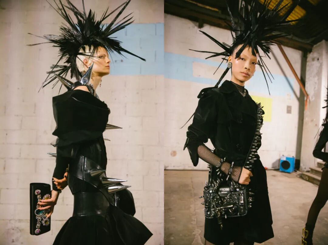 发饰被做成艺术版liberty spikes一般,和设计中大量出现的铆钉、皮衣、朋克元素,相互呼应。