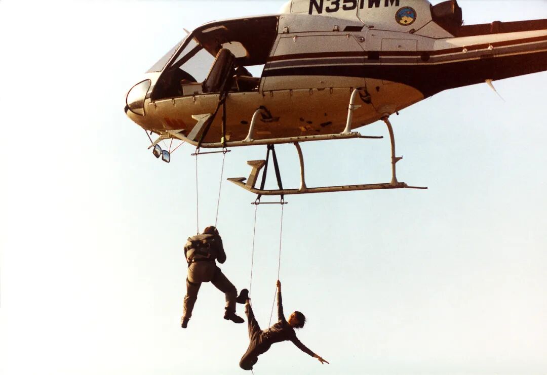 她甚至贡献了时装摄影史上难度最大的照片之一,1998年,她登上《国家地理》杂志,她吊在直升机外,在半空完成高难度舞蹈动作,飞跃经典的Hollywood标志。
