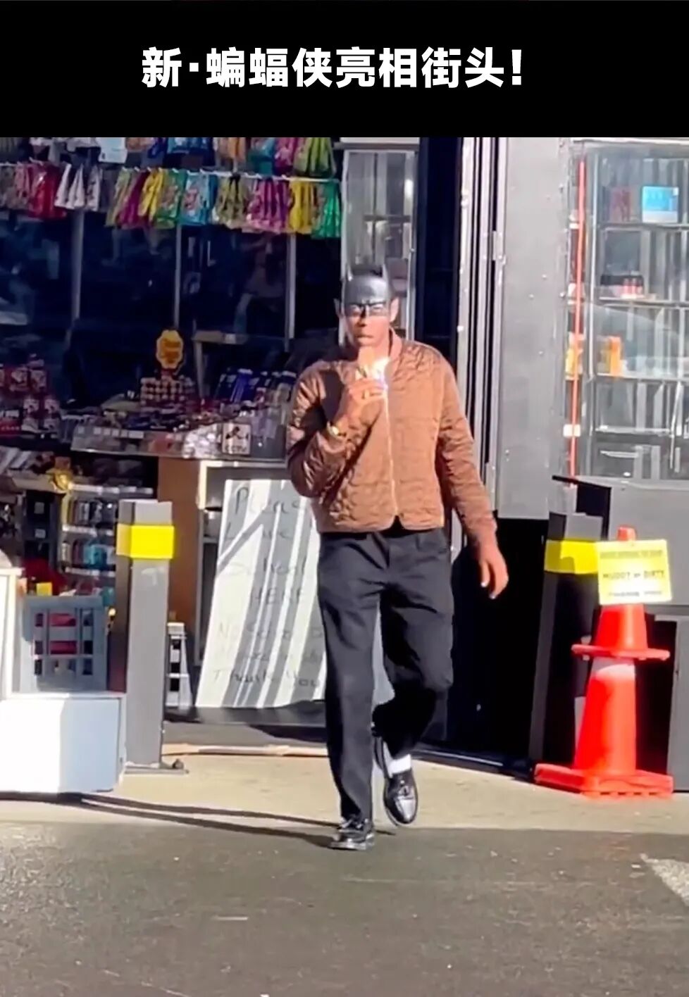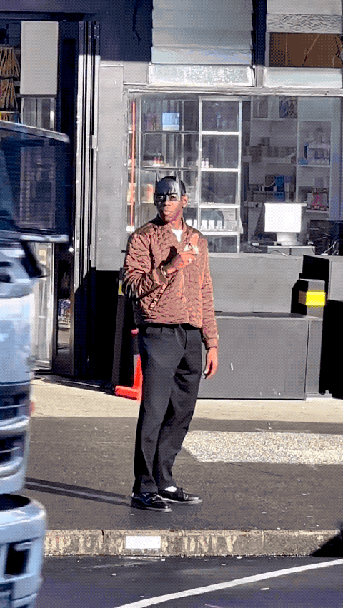 Such an iconic moment!在Tyler,the Creator生日当天,他被拍到头戴蝙蝠侠面具买雪糕吃,一身绗缝棉服、西裤还有白袜配乐福鞋的造型出现在街头。